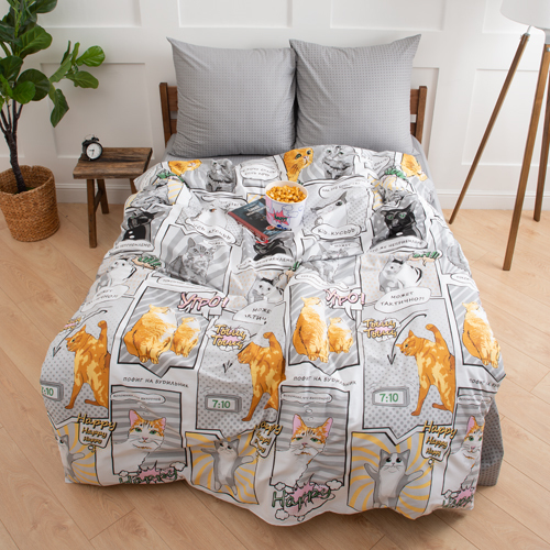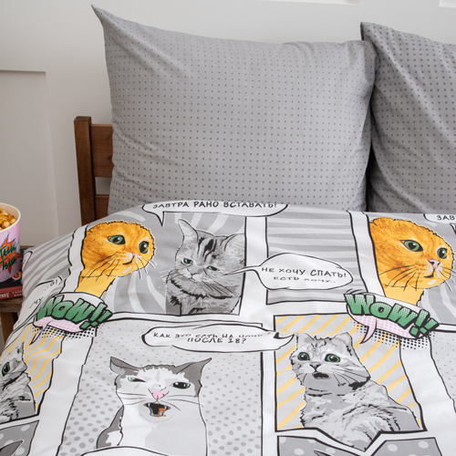 Ткань: Поплин Состав: 100% хлопок Дизайн: Коты мемы Линейка: Традиция Тематика: Абстракция Цветовая гама: Яркие тона Комплектация: Пододеяльник 146*217, простыня 150*217, наволочка 70*70 (2 шт.) Упако... Показать описаниевка: Пакет ПВХ, гофровставка, фирменный фотовкладыш. Транспортировочная упаковка - короб, вместимость 5 шт. Страна: Россия Комплект постельного белья "Традиция" изготовлен из набивного поплина плотностью 110 гр/кв.м. Поплин - хлопчатобумажная ткань, благодаря плотному переплетению нитей имеет высокую прочность и гладкость.Ткань мягкая и приятная к телу. Полотно, покорившее Европу, а за ней и весь мир, сегодня самый востребованный материал для постельного белья. Ткань не линяет, естественная усадка не превышает норму, обладает низкой сминаемостью, качество пошива фабричного уровня. Пододеяльник имеет прорезь, наволочки - клапан, простыня содержит открытые кромки. Дизайн "Коты мемы" входит в постоянную коллекцию. Пододеяльник двухсторонний, верхняя часть пододеяльника сшита из основной ткани, остальные изделия выполнены из ткани-компаньона, что придает комплекту "Коты мемы" особый стиль. Предложенная комплектация может незначительно отличаться от фотоизображения.