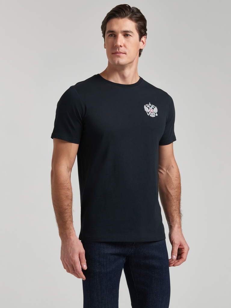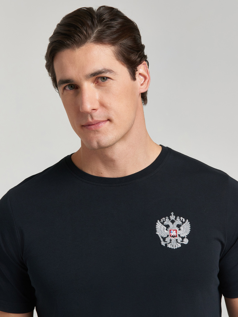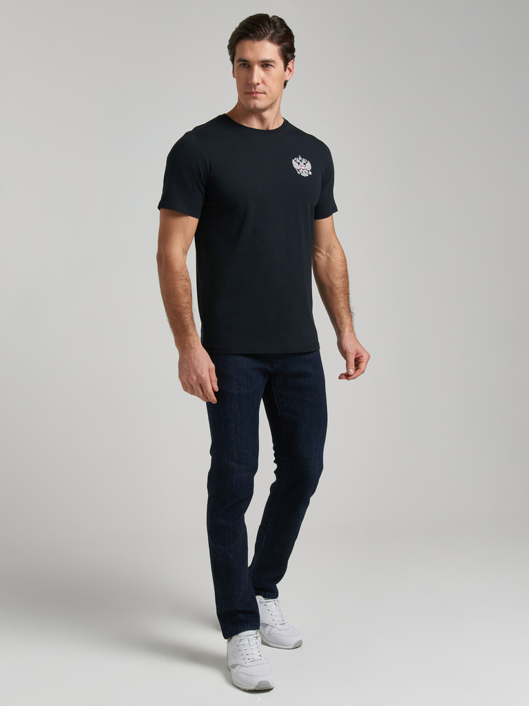 Спортивный костюм из хлопкового трикотажного полотна. Куртка костюма на поясе, с воротником-стойкой, застегивается на молнию. Рукава покроя реглан. Читать далее По плечевому шву рукавов и боковым швам... Показать описание брюк проложен кант белого цвета. Стилистика костюма поддерживается белой вставкой по плечам. карманы куртки и брюк прорезные с планками, застегиваются на молнии. Пояс, воротник и манжеты куртки изготовлены из эластичного подвяза с узкой белой полосой . Брюки прямые, зауженные книзу. Пояс брюк по линии талии с эластичной резинкой так же дополнительно регулируется шнуром. Слева на груди и под левым карманом брюк нашиты шевроны с фирменным логотипом...