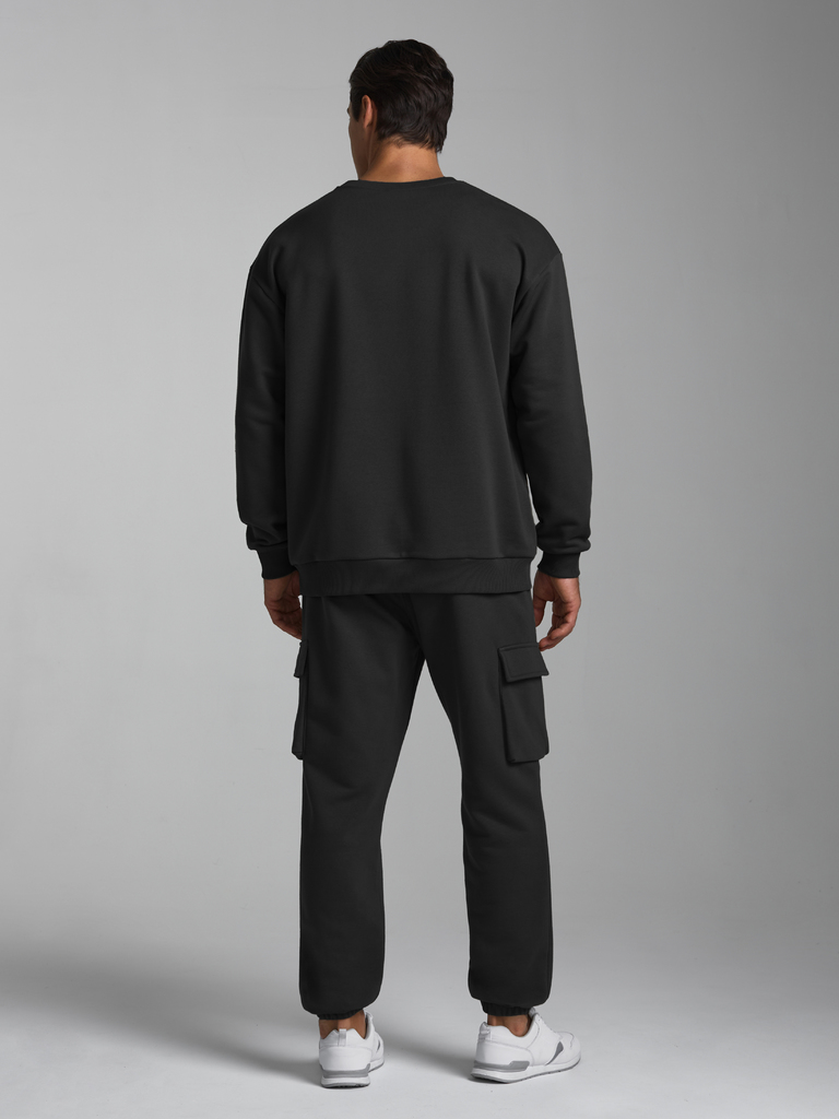 Мужской спортивный костюм , из плотного трикотажа с петельной изнанкой. Верх комплекта - свитшот ( джемпер) свободного силуэта. Рукава втачные, широкие со спущенной линией плеча. Читать далее Джемпер ... Показать описаниебез застежки. По вороту, низу рукавов и низу джемпера пришита рельефная трикотажная резинка. На брюках "Карго" два объемных накладных кармана с клапанамии и еще два кармана в боковых подрезах. Брюки зауженны книзу на манжет. Пояс брюк по линии талии с эластичной резинкой, дополнительно регулируется шнуром.