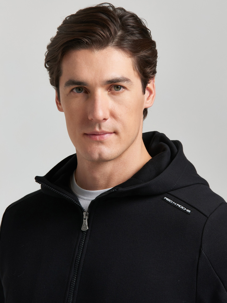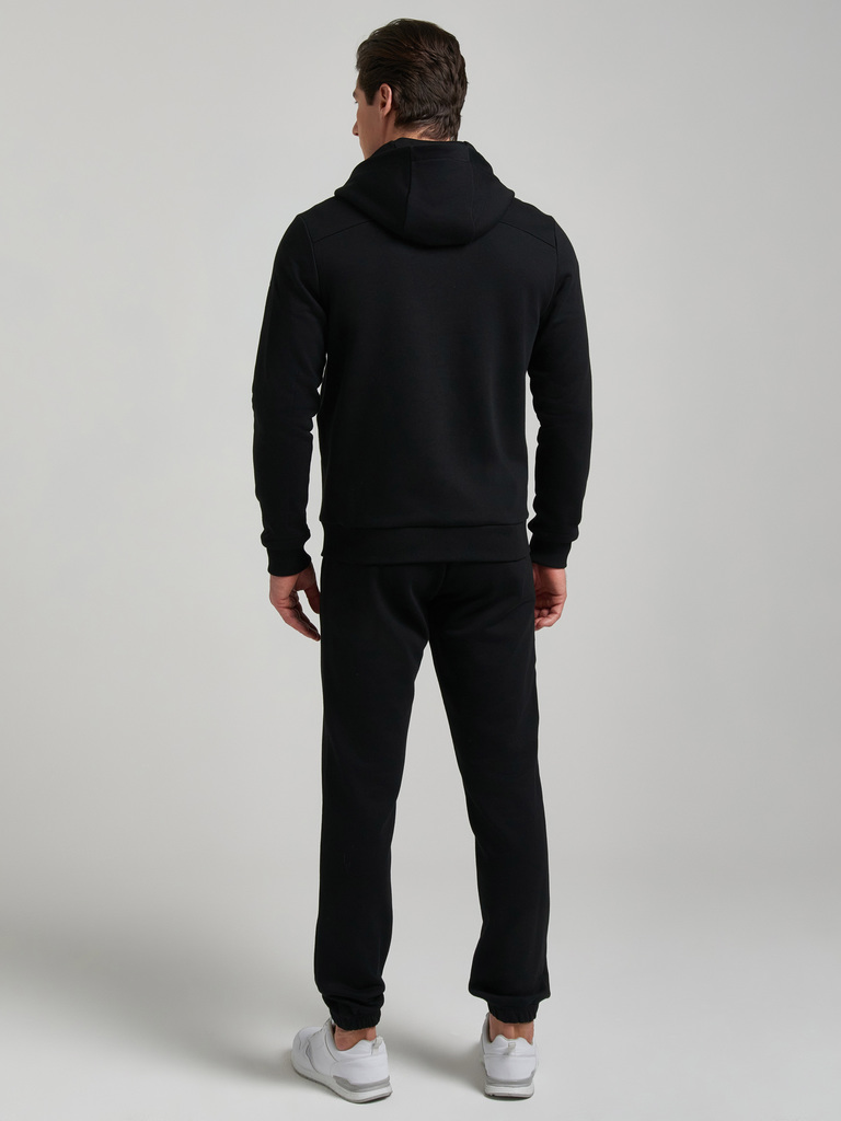 Мужско спортивный костюм из плотного хлопкового трикотажа с петельной изнанкой. Костюм состоит из куртки на молнии и брюк. Куртка свободного силуэта на поясе, с удобным капюшоном и воротником, рукава ... Показать описаниевтачные. Читать далее Карманы куртки и брюк с молниями. Низ брюк заужен на эластичную резинку. Задний карман брюк на молнии. В пояс брюк вшита резинка, ширина пояса дополнительно регулируется шнуром.