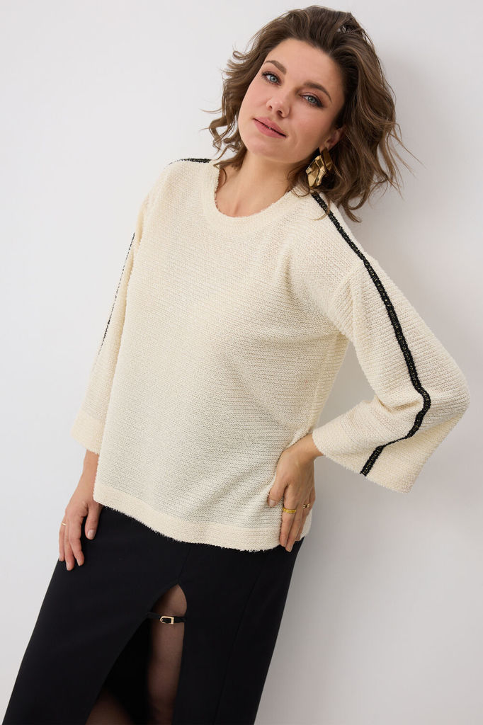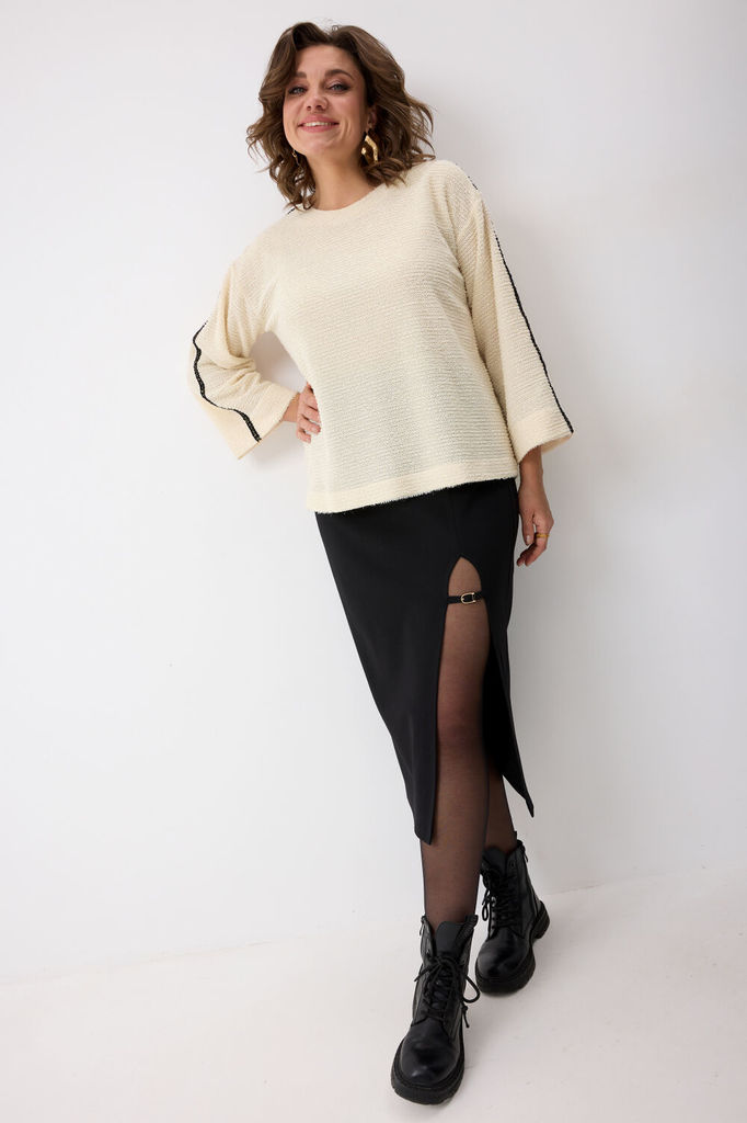 Состав: Вискоза-22%; ПЭ-74%; Спандекс-4%; Сезон: Осень-Зима Рост: 170 Страна бренда: Беларусь Состав: Вискоза-22%; ПЭ-74%; Спандекс-4%; Нежный свитшот свободного кроя из фактурного трикотажа с вплетен... Показать описаниеием мерцающих нитей в благородном оттенке топлёного молока - идеальный выбор для уютных и элегантных образов. Модель идеально впишется в Ваш гардероб, позволяя создавать множество современных сочетаний с жакетами, брюками, юбками и различной обувью. Свитшот с округлым вырезом обработанным обтачкой из основной ткани, пройма слегка спущена. Рукав ? расширяется к низу, вдоль рукава настрочена декоративная тесьма контрастного цвета с вплетением люрекса. Низ рукава и низ изделия обработаны подгибкой. Свитшот идеально сочетается с юбкой арт. 5018, а также с брюками арт. 6077. Для того, чтобы правильно подобрать свой размер, необходимо ваш замер объёма груди разделить на 2. (например, объём груди 104:2=52 размер). длина по спинке: 59 см длина рукава от горловины: 61 см Обхват груди: 106см/48р; 110см/50р; 114см/52р; 118см/54р; 122см/56р; 126см/58р; 130см/60р; 134см/62р. Рост фотомодели 174 см, размер одежды на фото 52. При подборе правильного размера, учитывайте, что для комфортной посадки у готового изделия должен быть запас на свободное прилегание. Все замеры выполнены в готовом изделии. Допуск расхождения в замерах +-2 см.