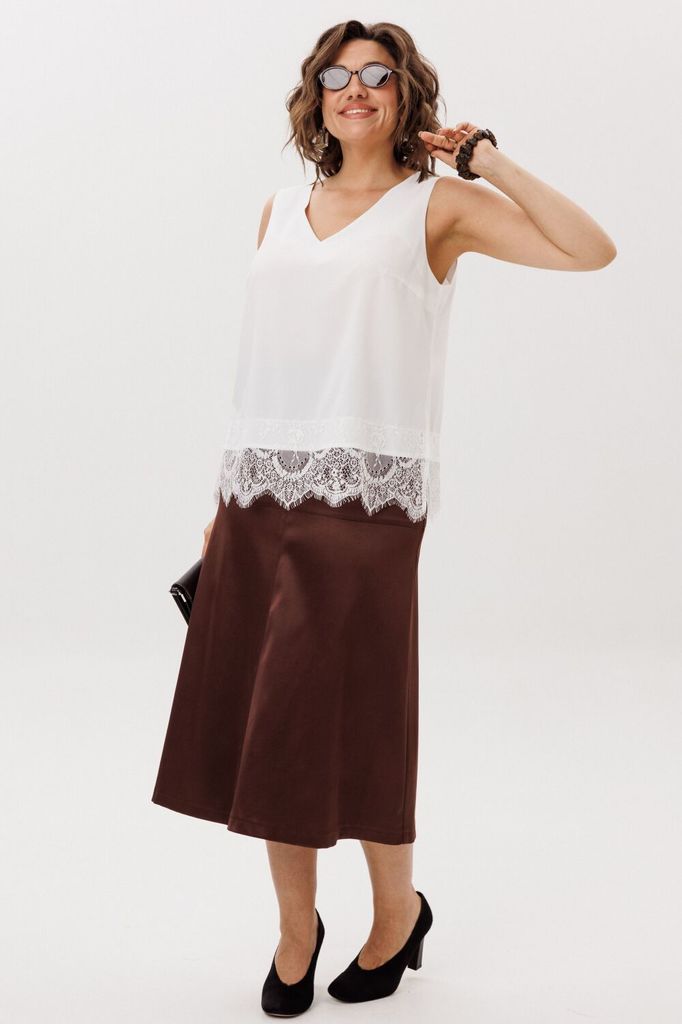 Состав: Вискоза-60%; ПЭ-40%; Сезон: Осень-Зима Рост: 164 Страна бренда: Беларусь Состав: Вискоза-60%; ПЭ-40%; Этот топ от Анелли — искусство быть неотразимой в любой момент. Его прямой силуэт служит и... Показать описаниедеальным фоном для изысканной игры деталей. Глубокий V-образный вырез мягко обрамляет линию шеи, придавая образу элегантную чувственность, а по бокам тонкие разрезы подчеркивают свободу и грацию движений. Но настоящая поэзия скрыта внизу: великолепное кружево, окаймляющее край, добавляет ноту романтики и загадочности. Он создан для того, чтобы его носить и как изюминку образа, кокетливо выглядывающую из-под строгого жакета или уютного свитера, и как самостоятельный акцент для особого случая. Это та самая вещь, что стирает границы между повседневной легкостью и вечерним шиком, делая каждый ваш день немного прекраснее. На модели в топе цвета «черный лед» атласные брюки 1737, юбка 1510, жакет 1661 и белая рубашка 1203.1. Замеры: Размер 52: ОГ-112; ОБ-116; ДИ-67; Размер 54: ОГ-116; ОБ-120; ДИ-70; Размер 56: ОГ-122; ОБ-126; ДИ-69; Размер 58: ОГ-126; ОБ-130; ДИ-70; Размер 60: ОГ-130; ОБ-134; ДИ-69; Размер 62: ОГ-134; ОБ-138; ДИ-70;