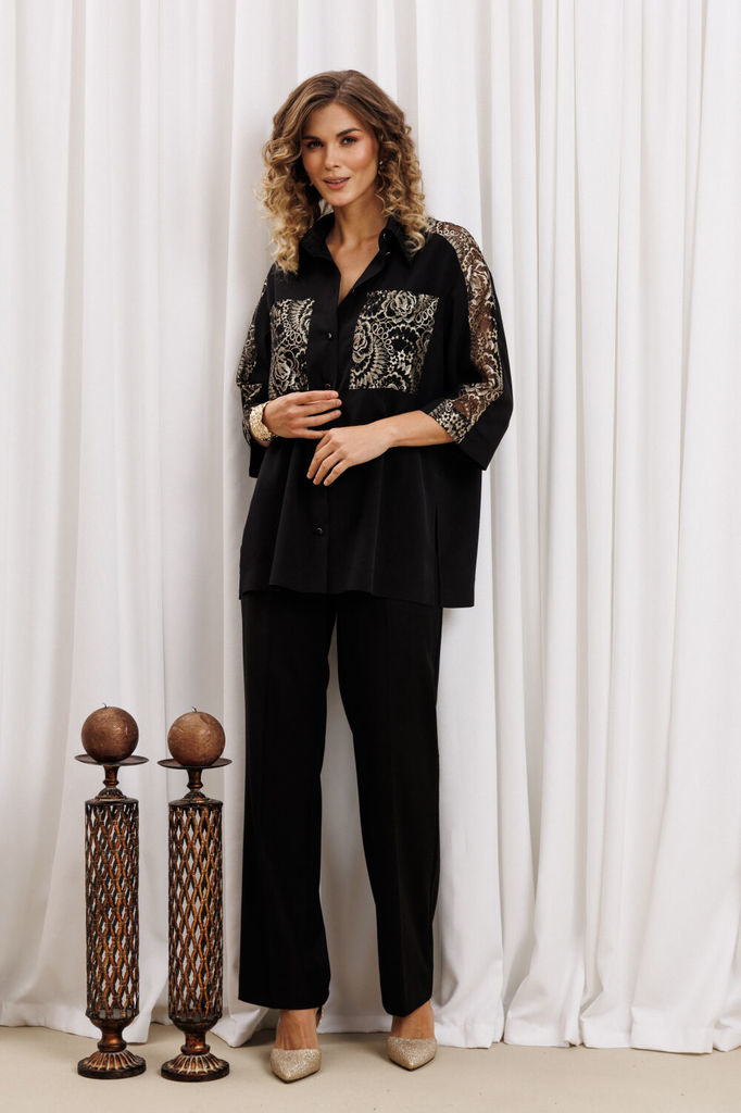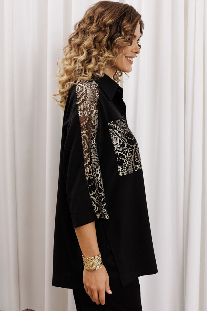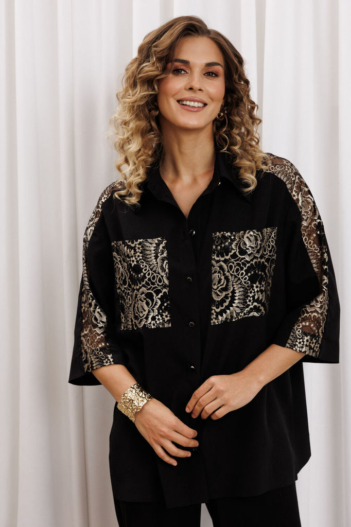 Состав: ПЭ-100%; Сезон: Осень-Зима Рост: 164 Страна бренда: Беларусь Состав: ПЭ-100%; Рубашка свободного силуэта из блузочного крепа. Застежка центральная на петли и пуговицы, воротник на стойке. ... Показать описание; В боковых швах разрезы. Рукав втачной рубашечного кроя. Карманы спереди и вставка вдоль плеча и рукава выполнеы из кружева. Длина рубашки- 71 см. длина рукава рубашки - 35 см.