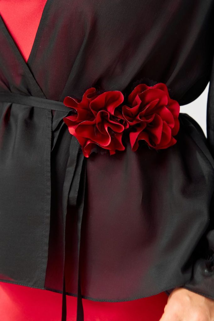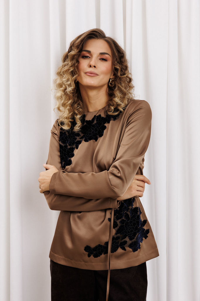 Состав: ПЭ-100%; Сезон: Осень-Зима Рост: 170 Страна бренда: Беларусь Состав: ПЭ-100%; Блузка прямого силуэта выполнена из атласной ткани. Перед с нагрудной вытачкой. Спинка со средним швом и застежкой... Показать описание "капелькой" на петлю и пуговицу сверху. Рукав втачной одношовный. В боковых швах разрезы. По переду настрочена аппликация из велюровых цветов на сетке. К блузке прилагается пояс из основной ткани. Длина блузки - 63 см, длина рукава - 61 см.