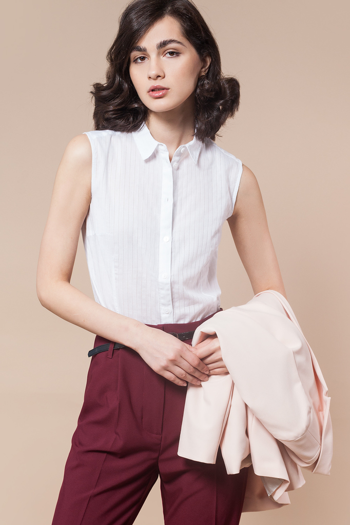Состав: 97%Хлопок 3%ПУ Базовая блузка из тонкого хлопка с фактурной полосой - отличное решение для летнего офиса, идеальный комфорт в комплектах с жакетами. Пуговицы под натуральный перламутр. Спинка ... Показать описаниеукрашена золотистым лого.