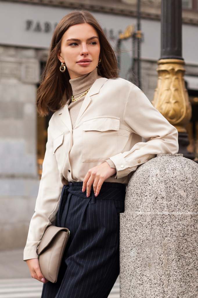 Состав: 100%Вис Блузка из премиальной вискозы в рубчик в стиле "сафари". Важный акцент эфффектные контрастные отделочные строчки, подчеркивающие этот стиль. Золотистые пуговицы являются ярким акцентом... Показать описание на классическом для стиля "сафари" бежевом цвете изделия