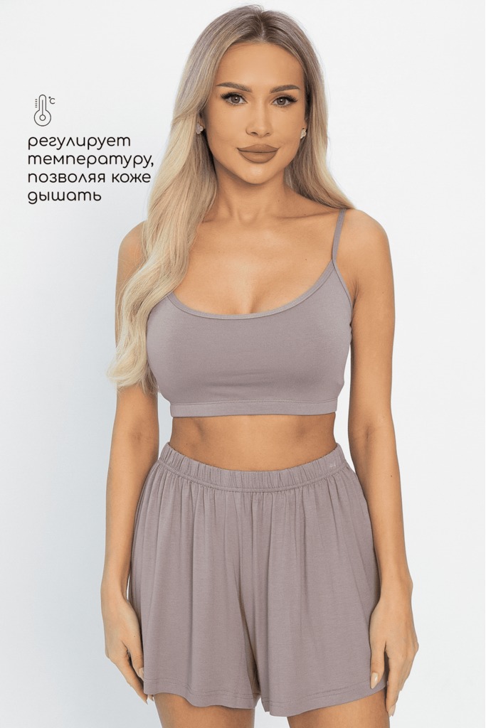 Состав : 95% вискоза, 5% лайкра Материал : трикотаж Цвет : коричневый Принт : отсутствует Силуэт : свободный Карманы : отсутствуют Резинка в поясе : да Вид застежки : без застёжки Декоративные элемент... Показать описаниеы : отсутствуют Костюм женский для дома, обеспечивающий максимальный комфорт, состоит из футболки и шорт. Футболка выполнена в свободном крое с короткими рукавами, шорты тоже свободные, с резинкой на талии. Этот комплект можно использовать как для сна, так и в качестве уютной домашней одежды. Внимание! Рекомендуем ориентироваться на размерную сетку и выбирать свой привычный размер, согласно размерной таблице. *Допуск отклонения длины при массовом производстве 1-3 см является нормой. Уход за изделием: Ручная стирка или стирка в машине при температуре до 30 °C, деликатный режим. Не использовать отбеливатели. Разрешена глажка при температуре до 110 °C. При глажке использовать специальную насадку на подошве утюга, гладить с паром. Не замачивать и не выжимать. Стирать изделие наизнанку, отдельно от других вещей.