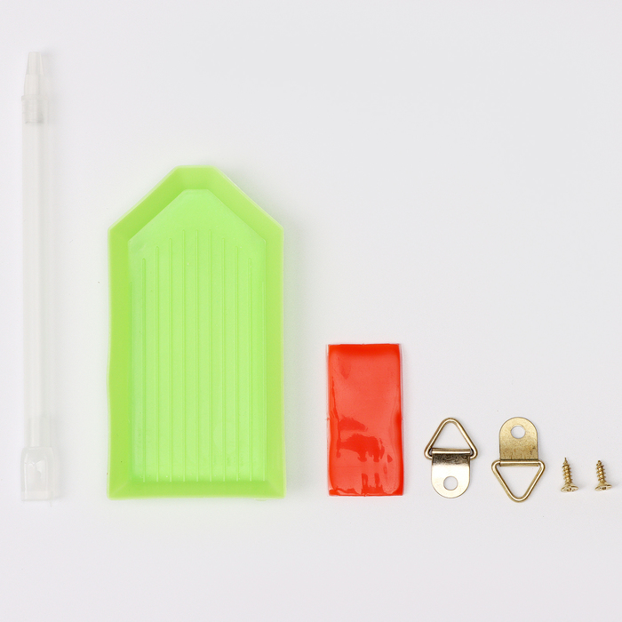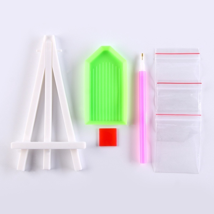 Алмазная мозаика — это отличный способ провести вечер в творческой атмосфере. Готовое изделие украсит интерьер или станет оригинальным подарком. Как работать с мозаикой 1. Для начала откройте небольшо... Показать описанией участок схемы, приподняв и отогнув защитную плёнку. Не открывайте всю схему сразу. 2. Из пакетика с номером, который соответствует схеме, отсыпьте в ёмкость немного стразов. 3. Возьмите специальный карандаш, окуните кончик в клеевую подушечку (розовый квадратик), возьмите страз. Таким образом заполните рисунок. Комплектация * картонная основа-картина; * 5 основ-стикеров; * 2 основы-магнита; * 2 основы-брелока; * стразы; * клеевая подушечка; * поддон для стразов; * специальный карандаш. * карабин; * мальберт;
