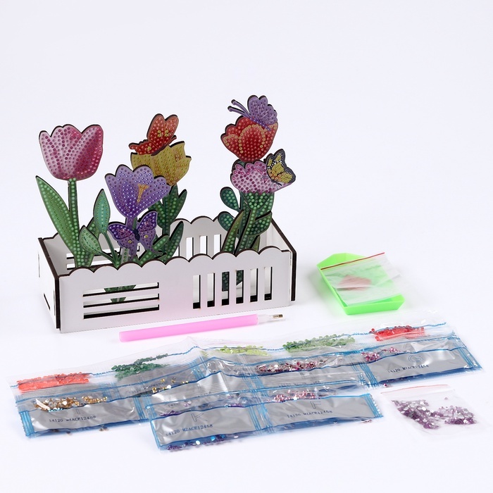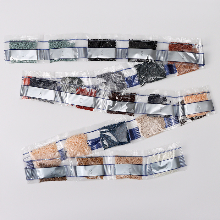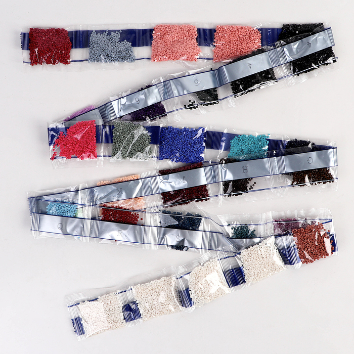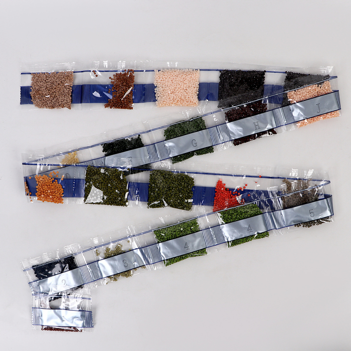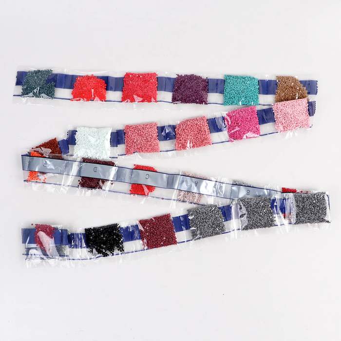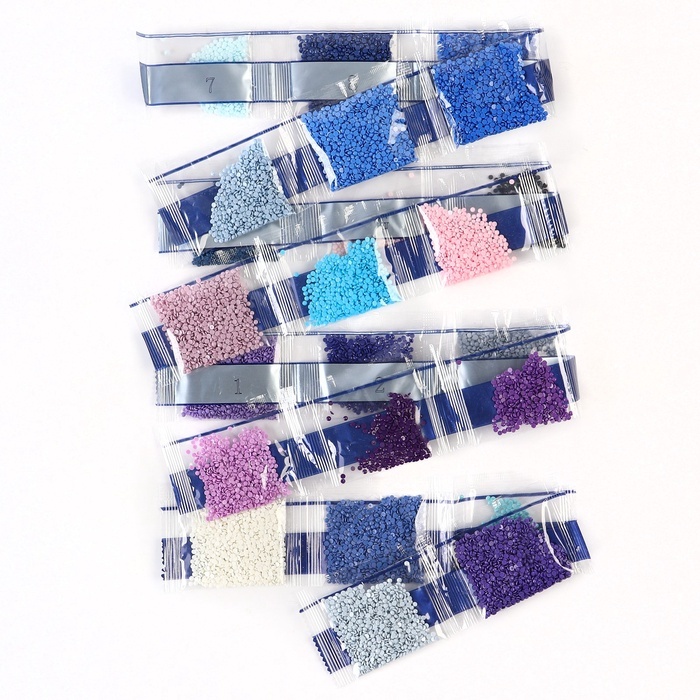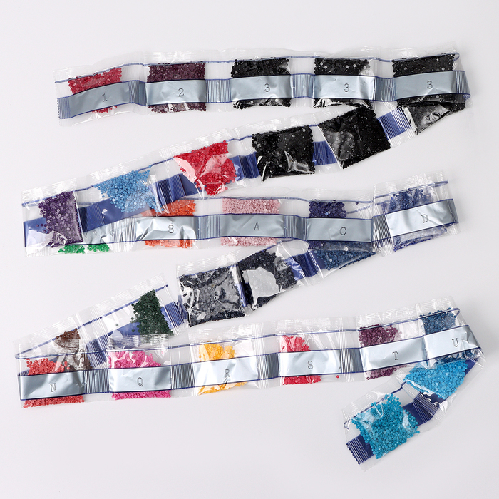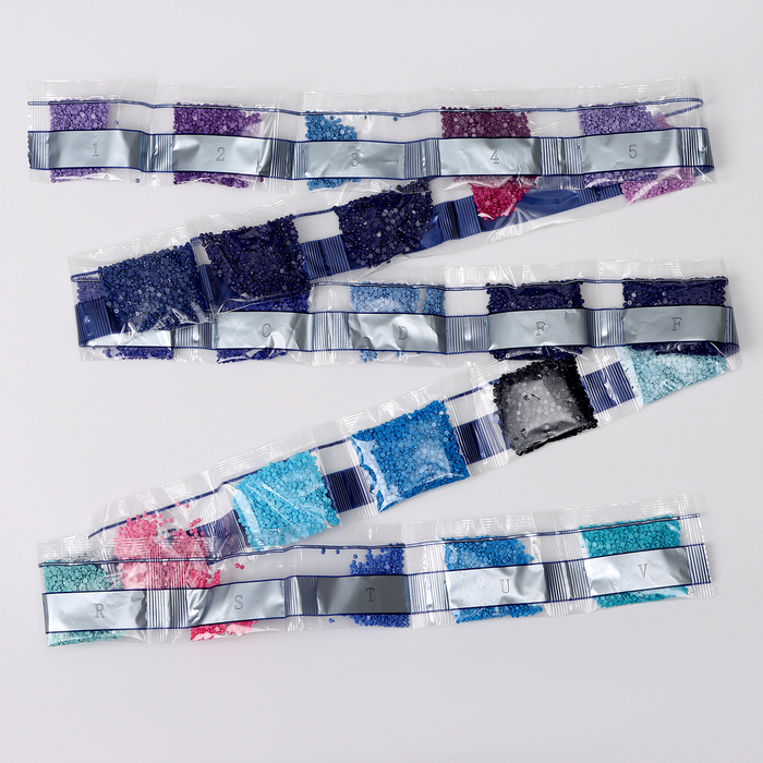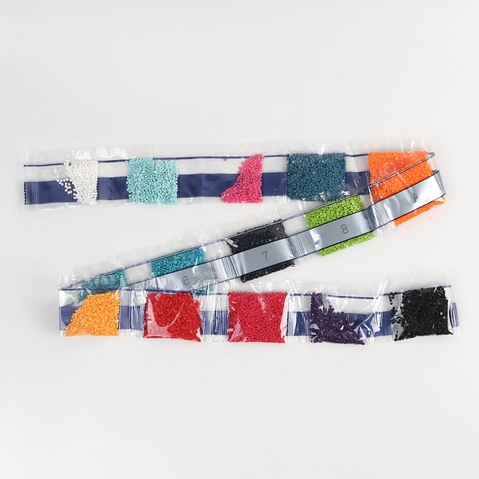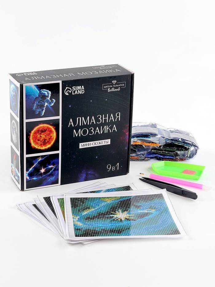 Алмазная мозаика — это увлекательный вид творчества, который понравится любому малышу! Вам предстоит разложить кристаллики карандашом по пронумерованной схеме. Холст с клеевым покрытием будет надёжно ... Показать описаниеудерживать стразы. Как создать мозаику 1. Для начала откройте небольшой участок схемы, приподняв и отогнув защитную плёнку. Не открывайте всю схему сразу. 2. Из пакетика с номером, который соответствует схеме, отсыпьте в ёмкость немного страз. 3. Возьмите специальный карандаш, окуните кончик в клеевую подушечку (розовый квадратик), возьмите страз. Таким образом заполните рисунок. Немного терпения, и сверкающая картина готова! Комплектация * 9 холстов * стразы * поддон для страз * стилус * клеевая подушечка * наклейки с номерами * зип пакеты * пинцет