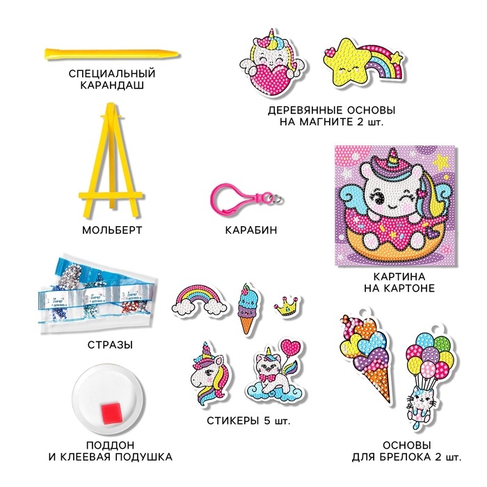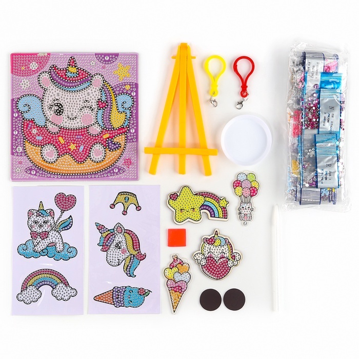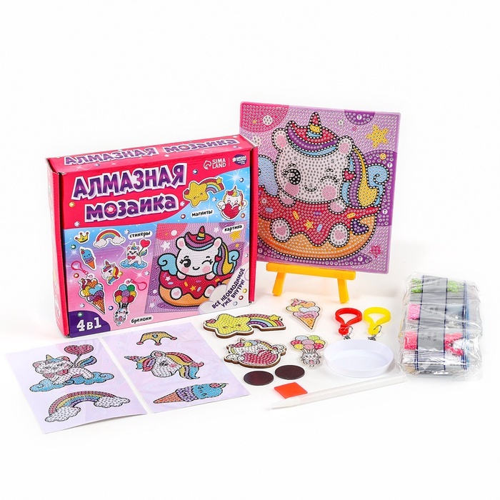 Алмазная мозаика 4в1 для детей. Создание стикеров, магнитов, брелоков и картины «Сказочные Единорожки», набор для творчестваВопросы по товару