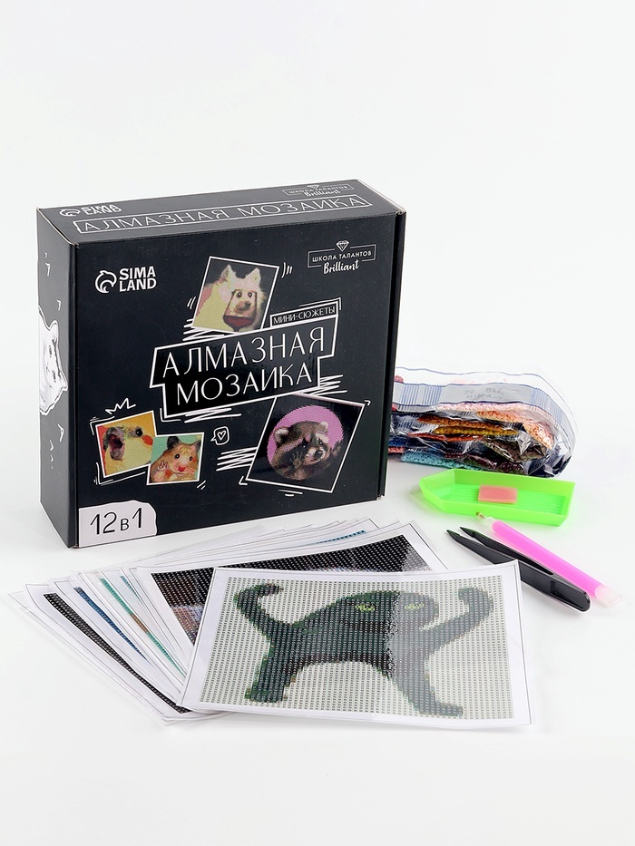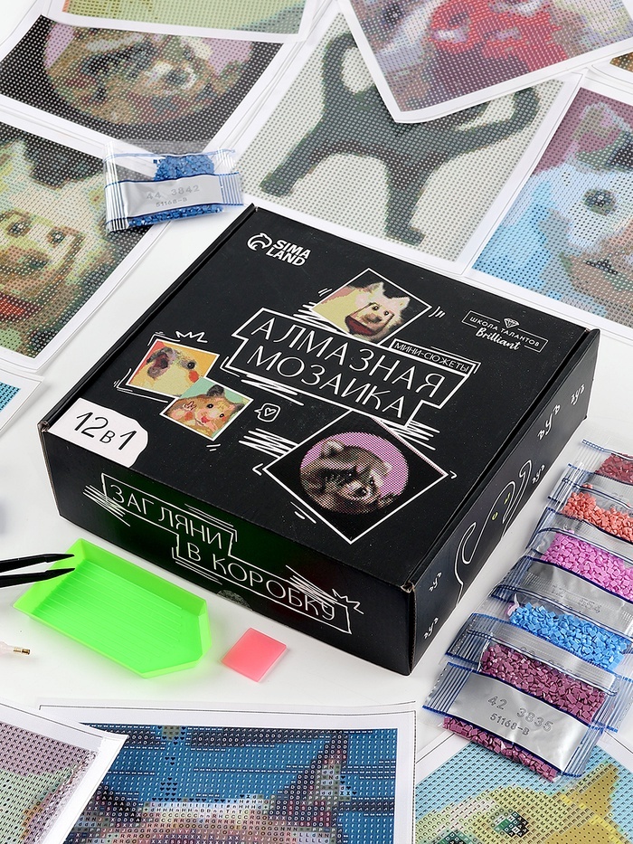 Алмазная мозаика — это увлекательный вид творчества, который понравится любому малышу! Вам предстоит разложить кристаллики карандашом по пронумерованной схеме. Холст с клеевым покрытием будет надёжно ... Показать описаниеудерживать стразы. Как создать мозаику 1. Для начала откройте небольшой участок схемы, приподняв и отогнув защитную плёнку. Не открывайте всю схему сразу. 2. Из пакетика с номером, который соответствует схеме, отсыпьте в ёмкость немного страз. 3. Возьмите специальный карандаш, окуните кончик в клеевую подушечку (розовый квадратик), возьмите страз. Таким образом заполните рисунок. Немного терпения, и сверкающая картина готова! Комплектация * 12 холстов * стразы * поддон для страз * стилус * клеевая подушечка * наклейки с номерами * зип пакеты * пинцет