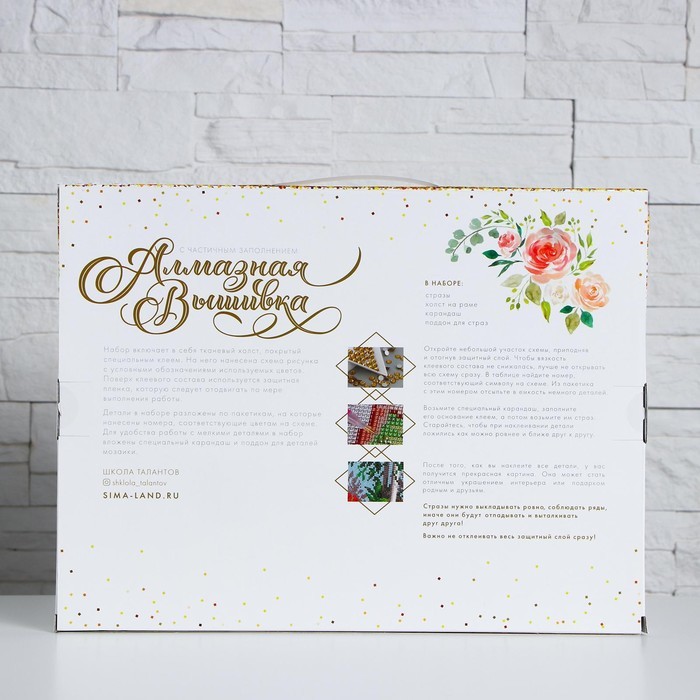 Алмазная мозаика на подрамнике. Холст с рисунком и клеевым слоем, натянут на прочный подрамник. Стразы наклеиваются «от края до края». Для размещения на стене в комплекте есть подвесы. В названии това... Показать описаниера указаны размеры печатного изображения на холсте. В комплект входит: * холст на подрамнике; * квадратные стразы; * инструкция; * набор инструментов для работы.