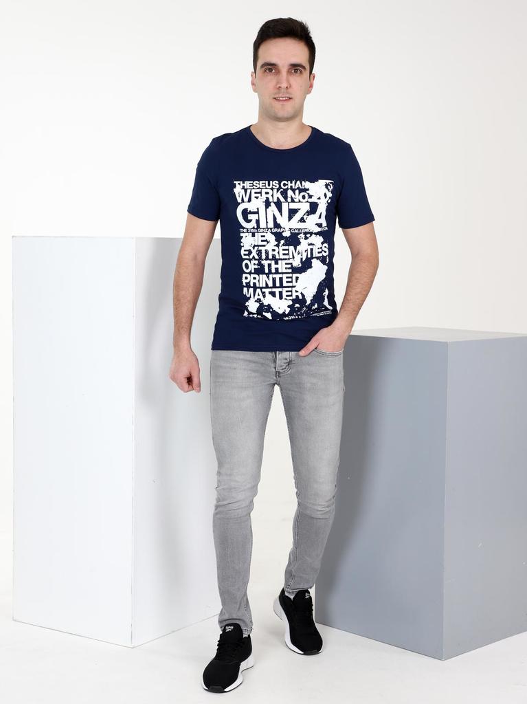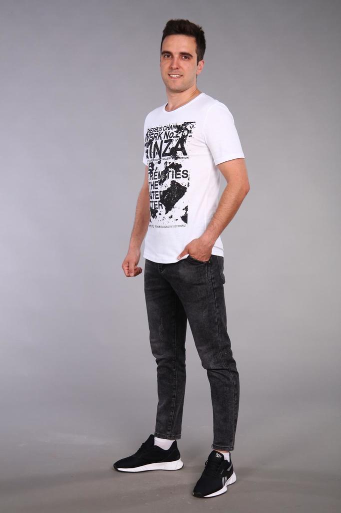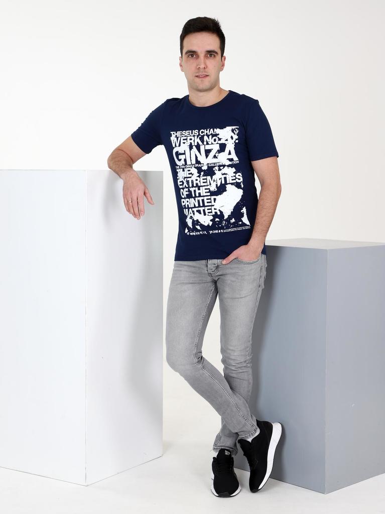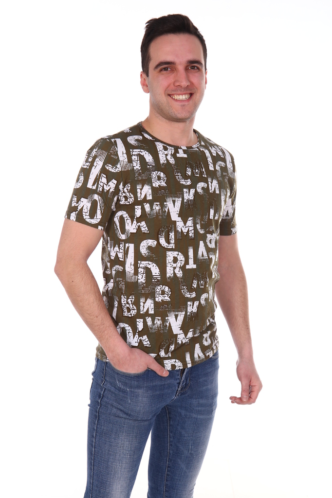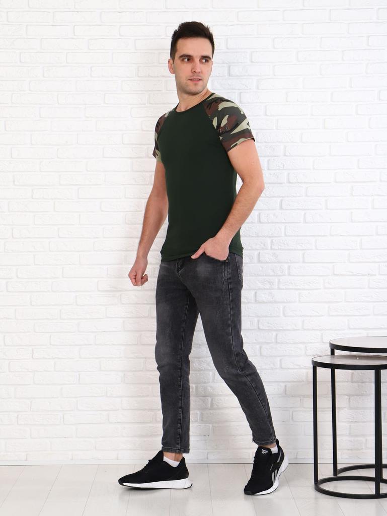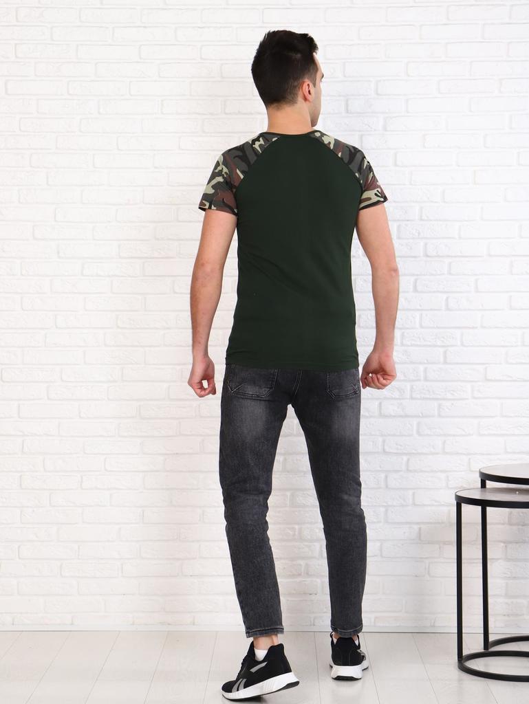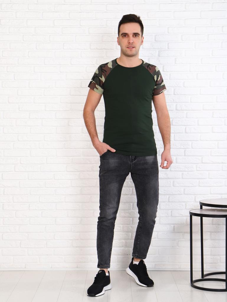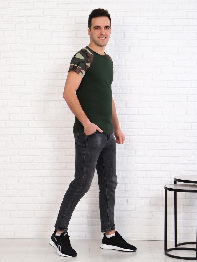 Трикотаж - Кулирка (Хлопок 100%). Мужская футболка выполнена из трикотажного полотна "кулирка".  Футболка полу прилегающего силуэта с коротким рукавом, горловина обработана обтачкой, передняя часть фу... Показать описаниетболки декорирована принтом, на рукавах вставки контрастных цветов.