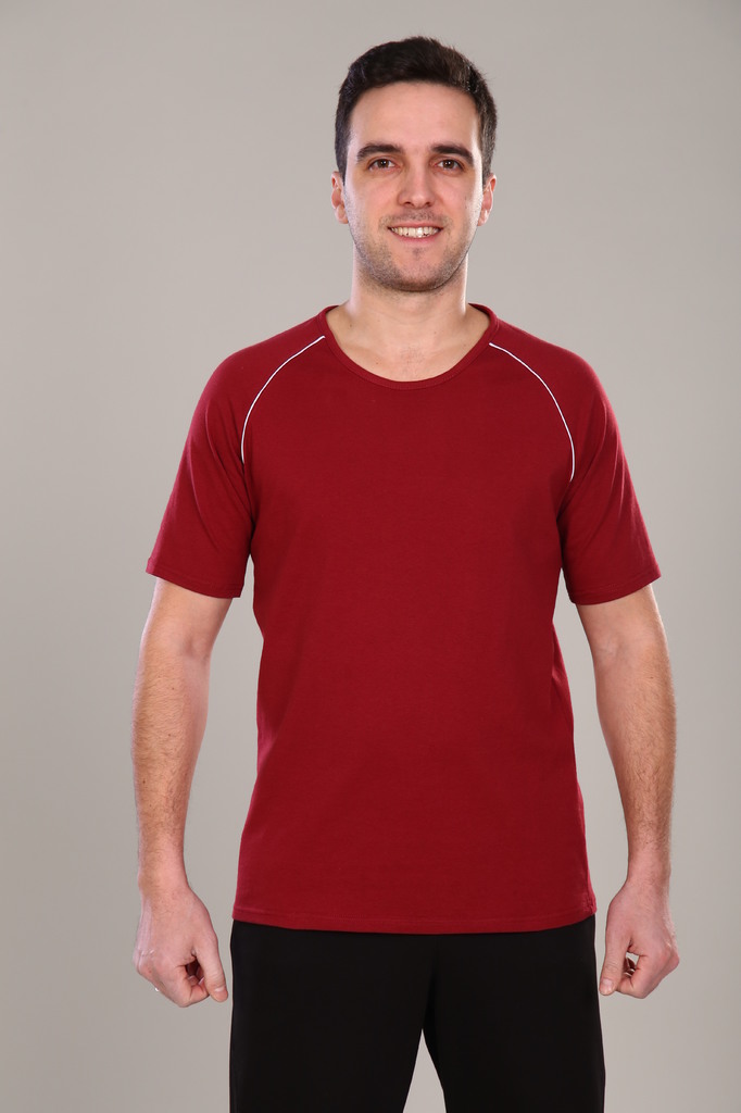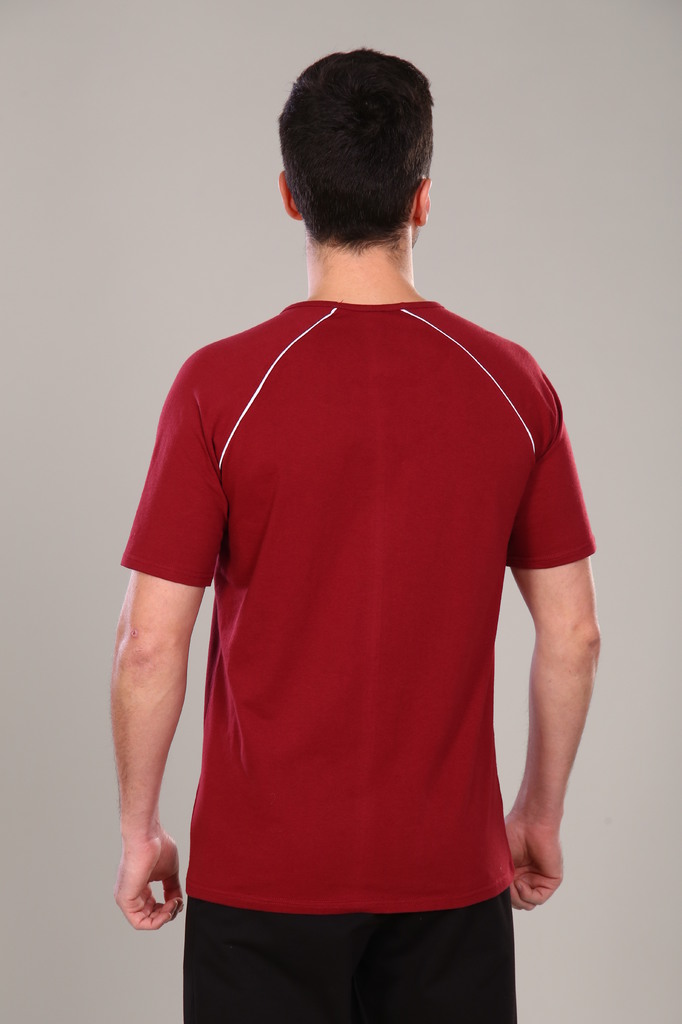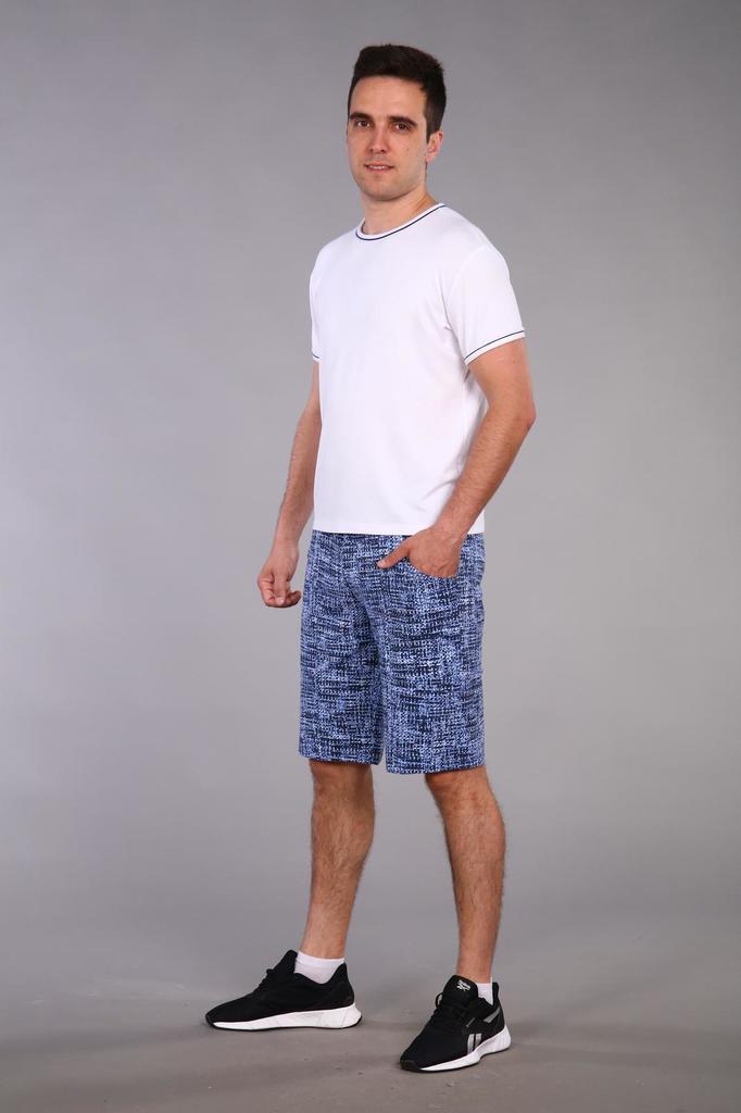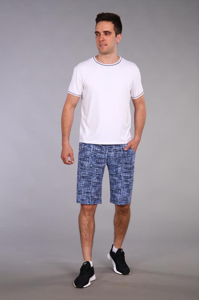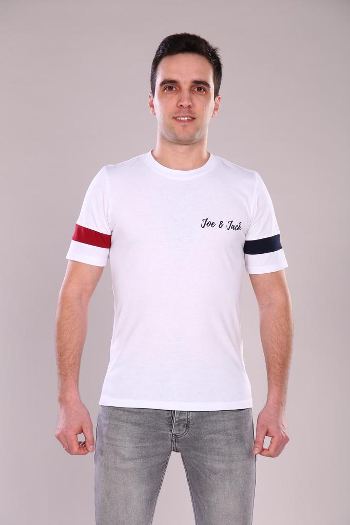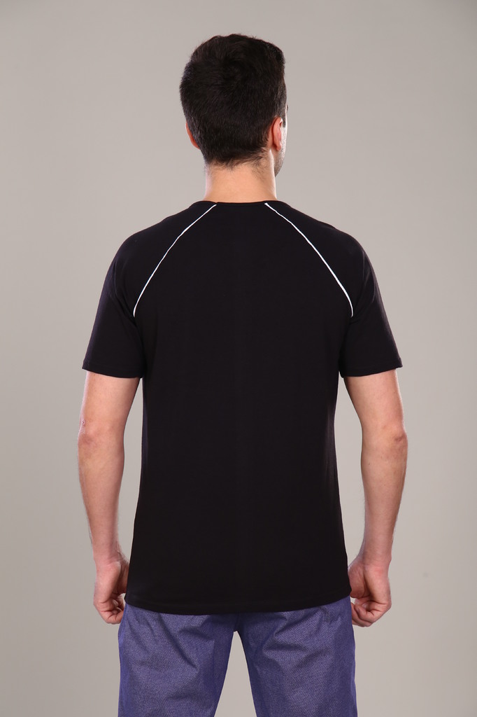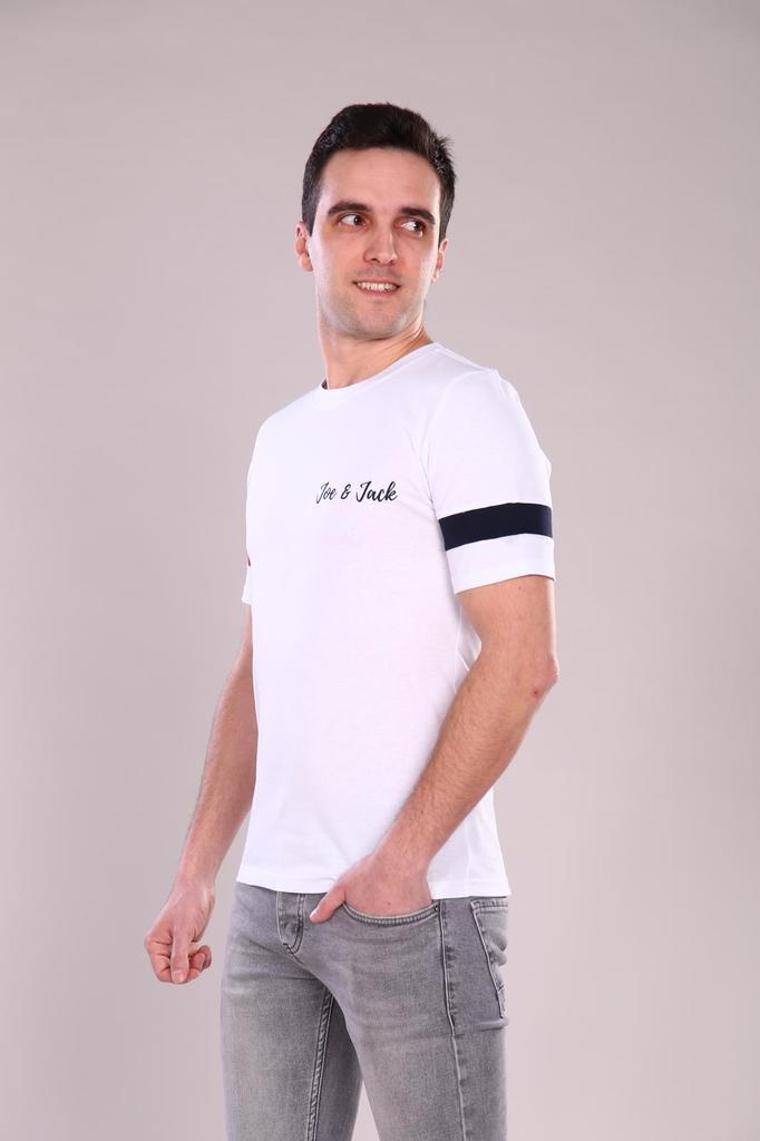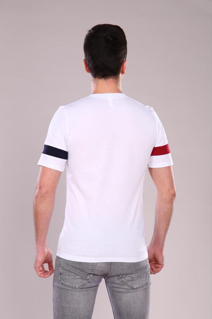 Трикотаж - Кулирка (Хлопок 100%). Мужская футболка выполнена из трикотажного полотна "кулирка".  Футболка полу прилегающего силуэта с коротким рукавом, горловина обработана обтачкой, передняя часть фу... Показать описаниетболки декорирована принтом, на рукавах вставки контрастных цветов.