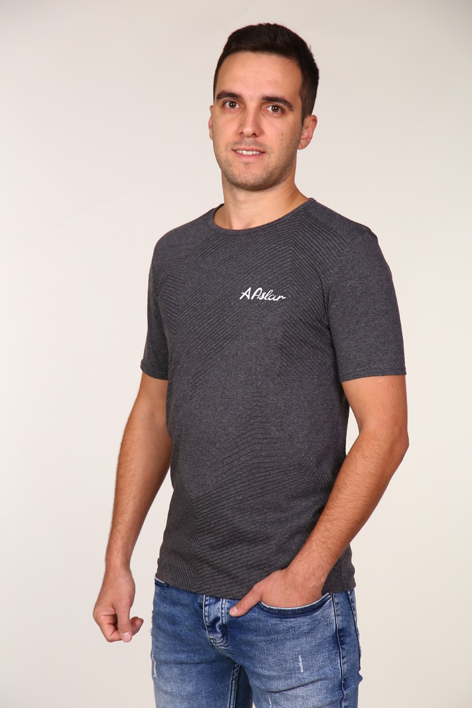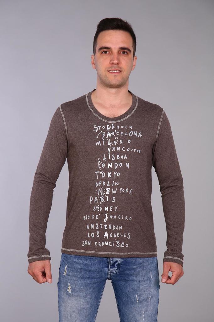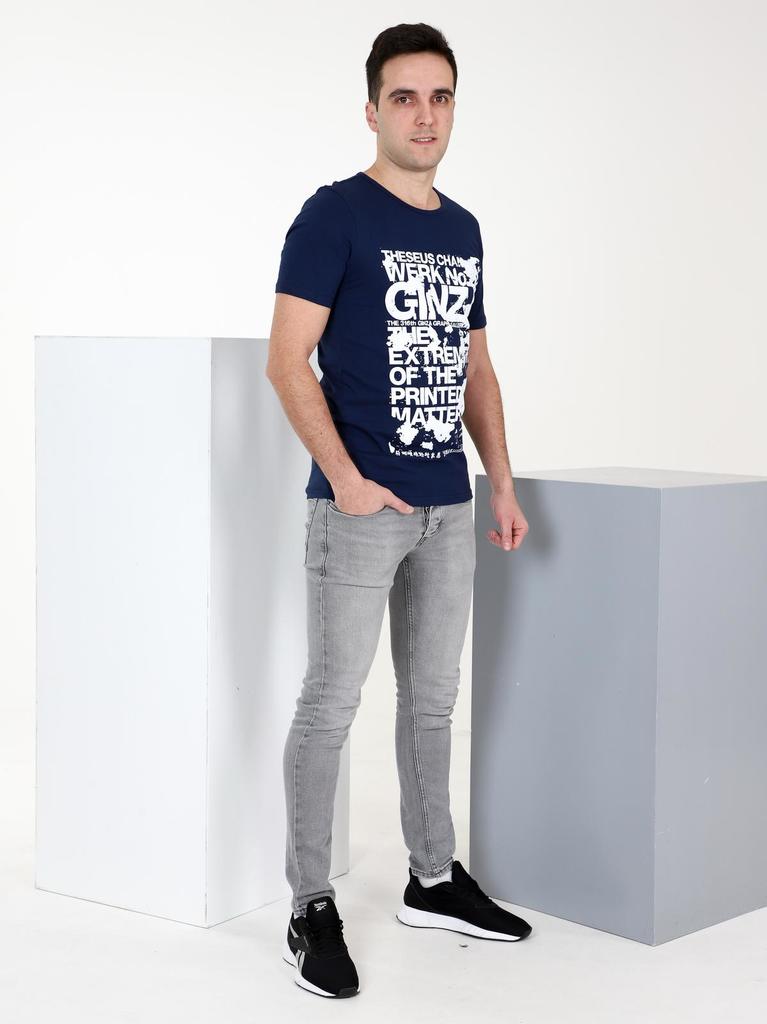 Трикотаж - Кулирка меланжированная (Хлопок 80%; Полиэстер 20%). Мужская футболка выполнена их трикотажного полотна "кулирка". Футболка полу прилегающего силуэта, с рукавом, горловина  с круг... Показать описаниелым вырезом, обработанным бейкой. Передняя часть футболки декорирована принтом.