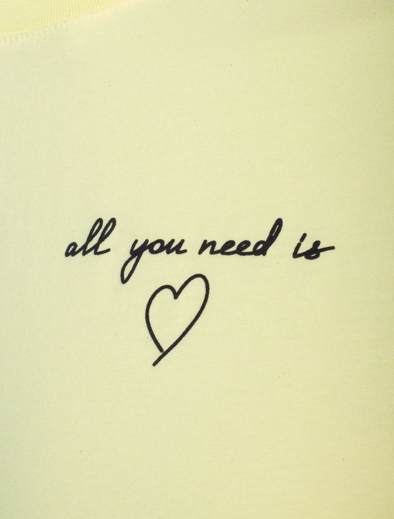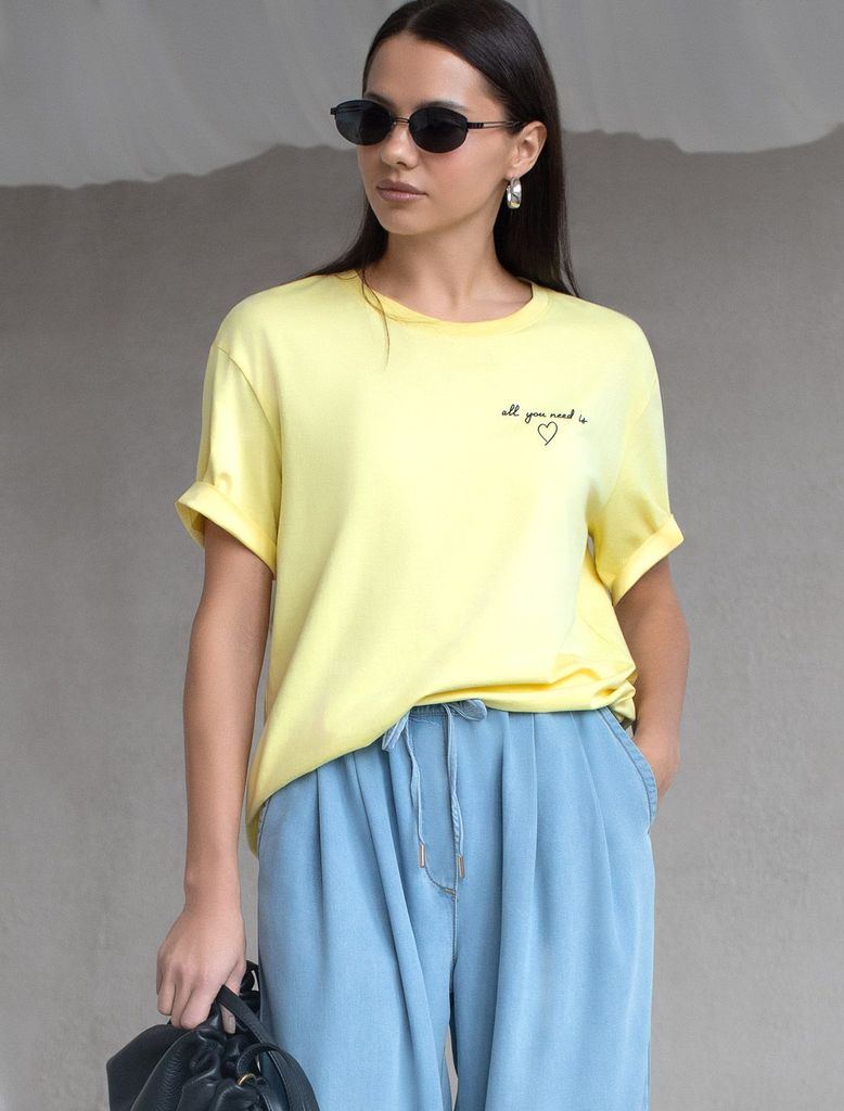 Состав: 92%Хлопок 8%ПУ Плотность: 170 Г/м2 Модная футболка лимонного цвета привлекает внимание своим интересным дизайном и ярким принтом. Благодаря прямому крою изделие комфортно садится на любую фигу... Показать описаниеру, в том числе на большие размеры, и не сковывает движений. Круглый вырез подчеркивает современный стиль, а натуральный материал из хлопка с добавлением эластана обеспечивает удобство в повседневной носке и приятные тактильные ощущения. Прочность и износостойкая структура позволяют сохранять свежий внешний вид после множества стирок. Принт в виде надписи и сердца нанесен красками с устойчивым покрытием, перевод надписи: Al you need is love- Все, что вам нужно это любовь. Стильная футболка гармонично вписывается в любой гардероб и подойдет для прогулок, отдыха или неформальных встреч. Благодаря особенностям кроя модель хорошо сидит, скрывая недостатки и подчеркивая достоинства. Яркая футболка идеально сочетается с базовыми вещами, позволяя создавать новые интересные образы каждый день.