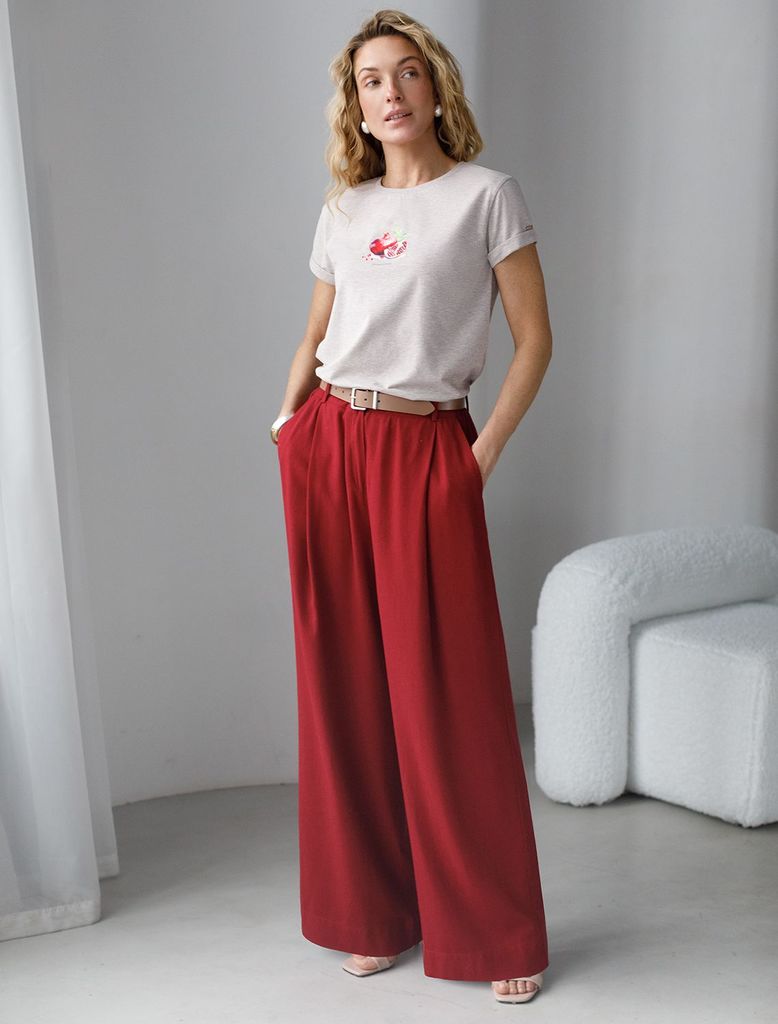Состав: 95%Хлопок 5%ПУ Плотность: 240 Г/м2 Брюки терракотового цвета прямого кроя выполнены из премиального футера-двухнитки. Лаконичный силуэт поддерживают застроченные стрелки, зрительно вытягивающи... Показать описаниее силуэт. Удобный пояс на резинке регулируется хлопковым шнурком с золотистой фурнитурой. Наличие эластана в составе изделия гарантирует комфорт и долговечность изделия. Эластичный материал хорошо пропускает воздух, позволяя телу дышать, и легко тянется, не ограничивая движения. Эти уютные брюки созданного для вашего комфорта. Нежный и стильный вариант подходит на любую фигуру, благодаря своей идеальной посадке. Свободный прямой крой обеспечивает свободу движений и максимальное удобство в любых ситуациях, поэтому они подойдут и на большие размеры, включая 56 размер. Стильный расклешенный крой добавляет изюминку в ваш образ. Эти брюки универсальны и могут стать отличным вариантом, как для занятий, так и для повседневной носки. Они легко вписываются в повседневный образ, благодаря универсальности и элегантности. Достоинства фигуры подчеркиваются, а силуэт визуально вытягивается за счет кроя палаццо и стрелок. В этих спортивных брюках вы будете чувствовать себя комфортно и уверенно, наслаждаясь каждым моментом дня. Рекомендуем сочетать с артикулами: D49.160, D49.167, D49.168