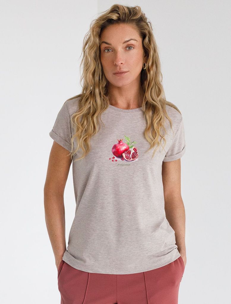 Состав: 92%Хлопок 8%ПУ Плотность: 170 Г/м2 Модная футболка кофейного цвета привлекает внимание своим интересным дизайном и ярким принтом. Благодаря прямому крою изделие комфортно садится на любую фигу... Показать описаниеру, в том числе на большие размеры, и не сковывает движений. Круглый вырез подчеркивает современный стиль, а натуральный материал из хлопка с добавлением эластана обеспечивает удобство в повседневной носке и приятные тактильные ощущения. Прочность и износостойкая структура сохраняет первоначальную форму футболки после множества стирок. Рукава имеют аккуратные подгибы, что придает изделию завершенность и помогает сохранять аккуратный внешний вид. Принт в виде фрукта гранат нанесен красками с устойчивым покрытием. Стильная футболка гармонично вписывается в любой гардероб и подойдет для прогулок, отдыха дома или неформальных встреч. Благодаря особенностям кроя модель хорошо сидит, скрывая недостатки и подчеркивая достоинства. Удобная футболка идеально сочетается с базовыми вещами, позволяя создавать новые интересные образы каждый день.