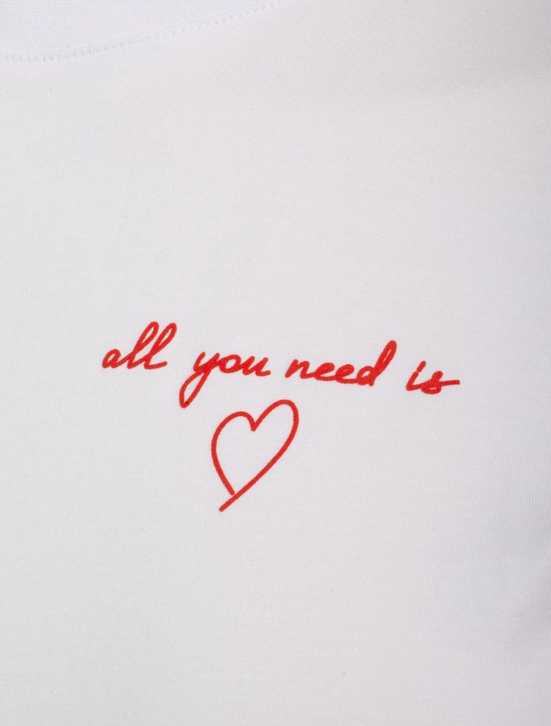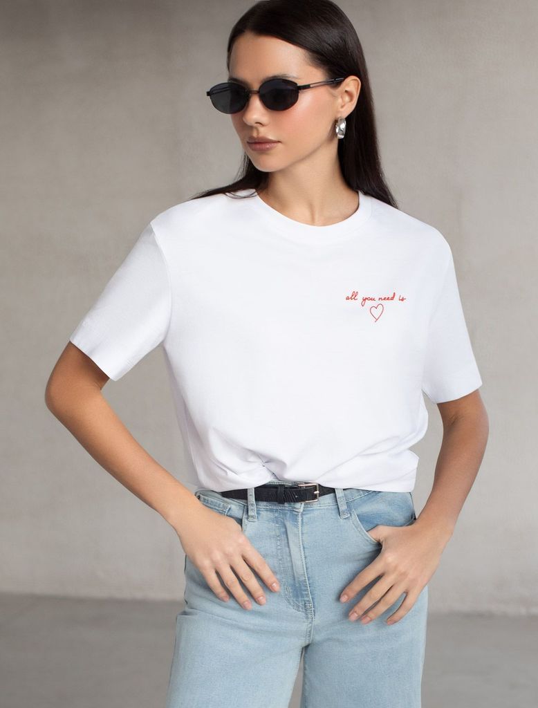 Состав: 92%Хлопок 8%ПУ Плотность: 170 Г/м2 Модная футболка белого цвета привлекает внимание своим интересным дизайном и ярким принтом. Благодаря прямому крою изделие комфортно садится на любую фигуру,... Показать описание в том числе на большие размеры, и не сковывает движений. Круглый вырез подчеркивает современный стиль, а натуральный материал из хлопка с добавлением эластана обеспечивает удобство в повседневной носке и приятные тактильные ощущения. Прочность и износостойкая структура позволяют сохранять свежий внешний вид после множества стирок. Принт в виде надписи и сердца нанесен красками с устойчивым покрытием, перевод надписи: Al you need is love- Все, что вам нужно это любовь. Стильная футболка гармонично вписывается в любой гардероб и подойдет для прогулок, отдыха или неформальных встреч. Благодаря особенностям кроя модель хорошо сидит, скрывая недостатки и подчеркивая достоинства. Яркая футболка идеально сочетается с базовыми вещами, позволяя создавать новые интересные образы каждый день.