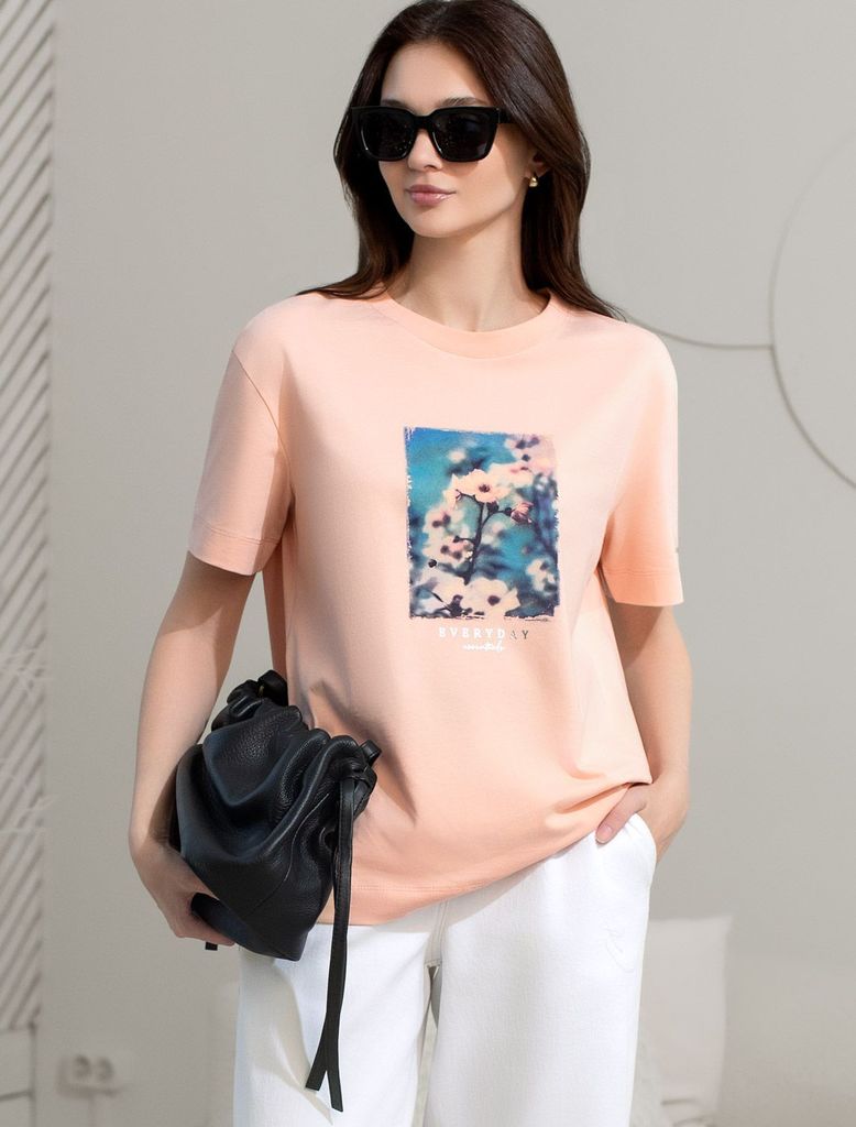 Состав: 92%Хлопок 8%ПУ Плотность: 170 Г/м2 Модная футболка пудрового цвета привлекает внимание своим интересным дизайном и ярким принтом. Благодаря прямому крою изделие комфортно садится на любую фигу... Показать описаниеру, в том числе на большие размеры, и не сковывает движений. Круглый вырез подчеркивает современный стиль, а натуральный материал из хлопка с добавлением эластана обеспечивает удобство в повседневной носке и приятные тактильные ощущения. Прочность и износостойкая структура позволяют сохранять свежий внешний вид после множества стирок. Принт в виде цветов и надписи нанесен красками с устойчивым покрытием, перевод надписи: Everyday essentials - Повседневные вещи, которые необходимы., Стильная футболка гармонично вписывается в любой гардероб и подойдет для прогулок, отдыха или неформальных встреч. Благодаря особенностям кроя модель хорошо сидит, скрывая недостатки и подчеркивая достоинства. Яркая футболка идеально сочетается с базовыми вещами, позволяя создавать новые интересные образы каждый день.