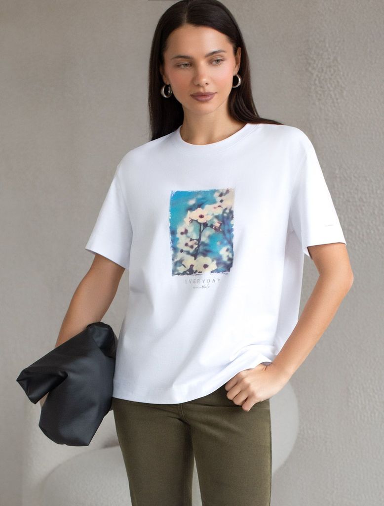 Состав: 92%Хлопок 8%ПУ Плотность: 170 Г/м2 Модная футболка белого цвета привлекает внимание своим интересным дизайном и ярким принтом. Благодаря прямому крою изделие комфортно садится на любую фигуру,... Показать описание в том числе на большие размеры, и не сковывает движений. Круглый вырез подчеркивает современный стиль, а натуральный материал из хлопка с добавлением эластана обеспечивает удобство в повседневной носке и приятные тактильные ощущения. Прочность и износостойкая структура позволяют сохранять свежий внешний вид после множества стирок. Принт в виде цветов и надписи нанесен красками с устойчивым покрытием, перевод надписи: Everyday essentials - Повседневные вещи, которые необходимы., Стильная футболка гармонично вписывается в любой гардероб и подойдет для прогулок, отдыха или неформальных встреч. Благодаря особенностям кроя модель хорошо сидит, скрывая недостатки и подчеркивая достоинства. Яркая футболка идеально сочетается с базовыми вещами, позволяя создавать новые интересные образы каждый день.