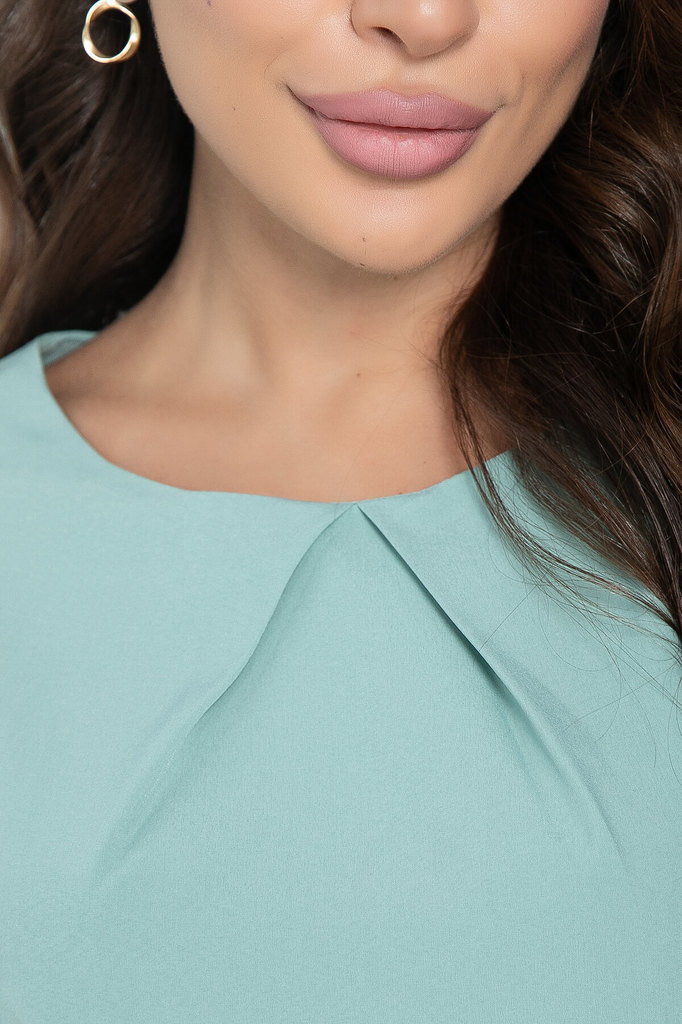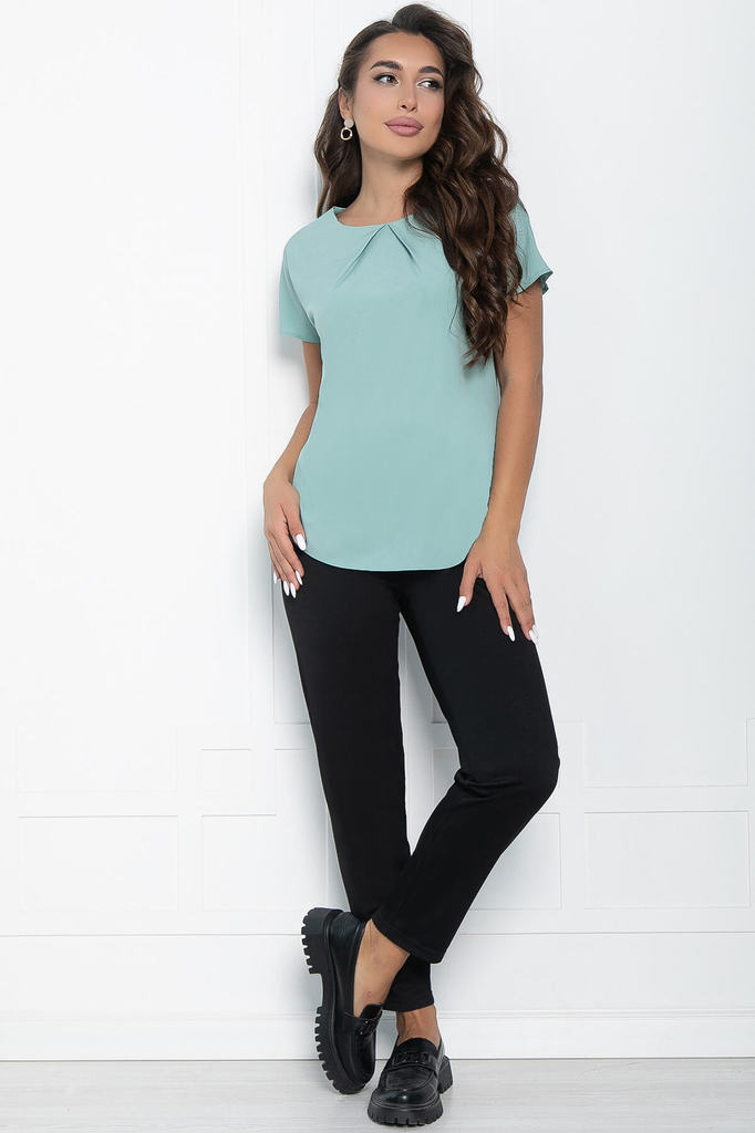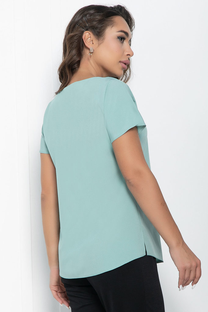 Ткань: блузочная, синтетическая, легкая, приятна к телу. Состав: 100 полиэстер. Цвет: зеленый (оттенок мятный). Принт: нет. Вид застежки: без застёжки. Силуэт: полуприлегающий. Карманы:... Показать описание отсутствуют. Декоративный элемент: нет. Размер на модели: 44. Рост модели: 167 см. Базовая, женственная блуза с коротким цельнокроеным рукавом, для удобства разрезы по бокам низа блузки. Декоративная угловая складка у выреза горловины. Уход за изделием: ручная стирка до 30 градусов; нельзя отбеливать; деликатный отжим; гладить при t не более 110 С; гладить с изнанки. *Допуск отклонения длины при массовом производстве 1-3 см является нормой.