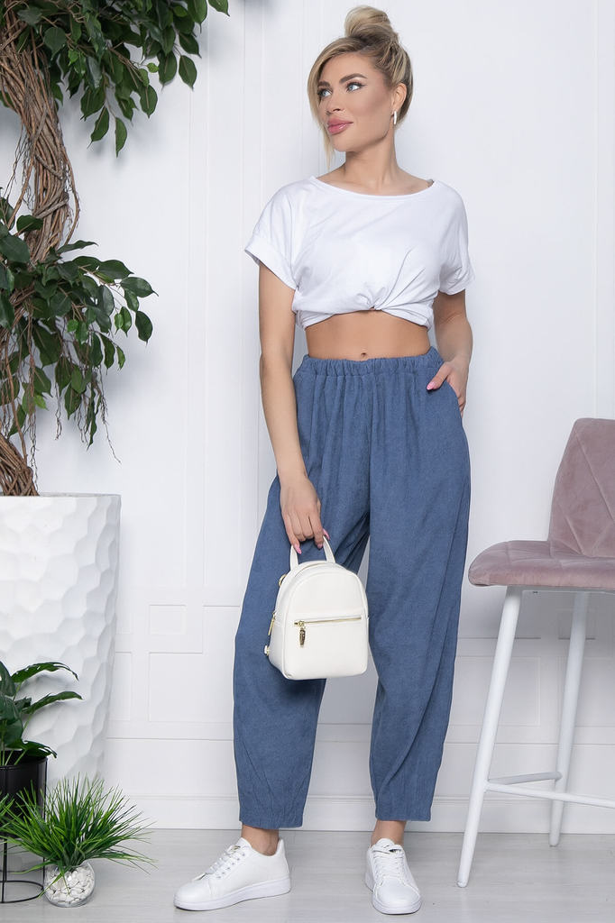 Артикул: Б10843. Тип ткани: смесовая. Состав: 98% п/э, 2% эластан. Материал: микровельвет. Цвет: голубой. Принт: отсутствует. Вид застежки: отсутствует. Талия на резинке. Тип посадки: средня... Показать описаниея. Фасон: джоггеры. Пояс: отсутствует. Крой: свободный. Резинка в поясе: есть. Карманы: есть. Декоративные элементы: отсутствуют. Длина готового изделия по внутреннему шву: 44/ 64 см, 46/ 65 см, 48/ 66 см, 50/ 67 см, 52/ 68 см, 54/ 69 см. Длина готового изделия по боковому шву: 44-46/ 91 см, 48-50/ 92 см, 52-54/ 95 см. Размер изделия на модели: 44. Рост модели: 167 см и 170 см. Объёмные брюки в стиле бохо - это свободный непринужденный стиль современной моды. Шароварный силуэт создается за счет резинки по талии, свободной посадки в бедрах, бокового защипа по низу и оригинального высокого манжета в виде тюльпана. Свободные, прямые, просторные брюки бананы выгодно подчеркивают женские формы и скрывают недостатки. Комбинируйте их с различными видами топов, джемперов, блузок или футболок. Брюки выполнены из комфортной в носке ткани, которая не вытягивается и не деформируется после стирки. Уход за изделием: ручная стирка до 30 градусов; нельзя отбеливать; отжим запрещён; гладить при t не более 110 С; гладить с изнанки. *Допуск отклонения длины при массовом производстве 1-3 см является нормой.