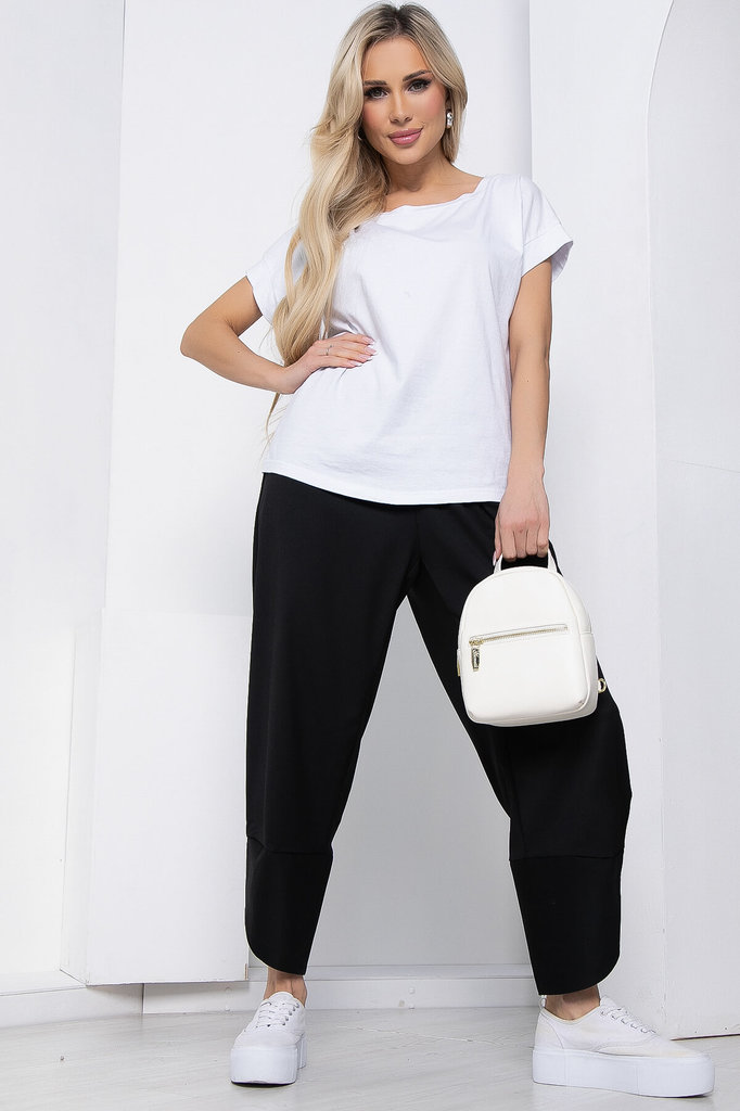 Артикул: Б8774. Ткань: штапель. Состав: 100% хлопок. Цвет: черно-белая. Вид застежки: без застёжки. Силуэт: свободный. Карманы: отсутствуют. Тип горловины: округлый. Длина изделия по спинке:... Показать описание 46/ 64 см, 48/ 65 см, 50/ 66 см, 52/ 67 см, 54/ 68 см, 56/ 69 см. Рост модели: 170 см. Стильная и необычная футболка с надписями прекрасно дополнит ваш повседневный образ. Рукав укороченный, со спущенным плечевым швом. Отлично будет смотреться как с джинсами, так и с укороченными брюками, шортами, короткими или длинными юбками. Уход за изделием: ручная стирка до 30 градусов; нельзя отбеливать; деликатный отжим; гладить при t не более 110С; гладить с изнанки. *Допуск отклонения длины при массовом производстве 1-3 см является нормой.