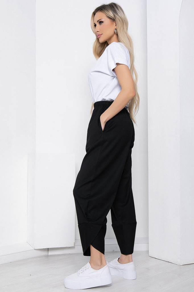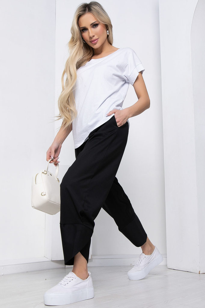 Артикул: Б8566. Ткань: костюмная ткань. Состав: 63% вискоза, 34% п/э, 3% эластан. Цвет: черный. Вид застежки: отсутствует. Силуэт: свободный. Карманы: есть. Длина изделия по боковому шву:&nb... Показать описаниеsp;44/ 88 см, 46/ 89 см, 48/ 90 см, 50/ 91см, 52-54/ 92 см. Рост модели: 168 см. Поклонницы бохо знают толк в моде и ценят комфорт. Черные широкие брюки в стиле бохо для полной свободы в движении. Такая модель брюк будет смотреться отлично как со спортивным верхом, так и с классическим. Удобная эластичная талия. Оригинальные зауженные манжеты в нахлест придают изделию особый шарм. Уход за изделием: ручная стирка до 30 градусов; нельзя отбеливать; деликатный отжим; гладить при t не более 110С; гладить с изнанки. *Допуск отклонения длины при массовом производстве 1-3 см является нормой.