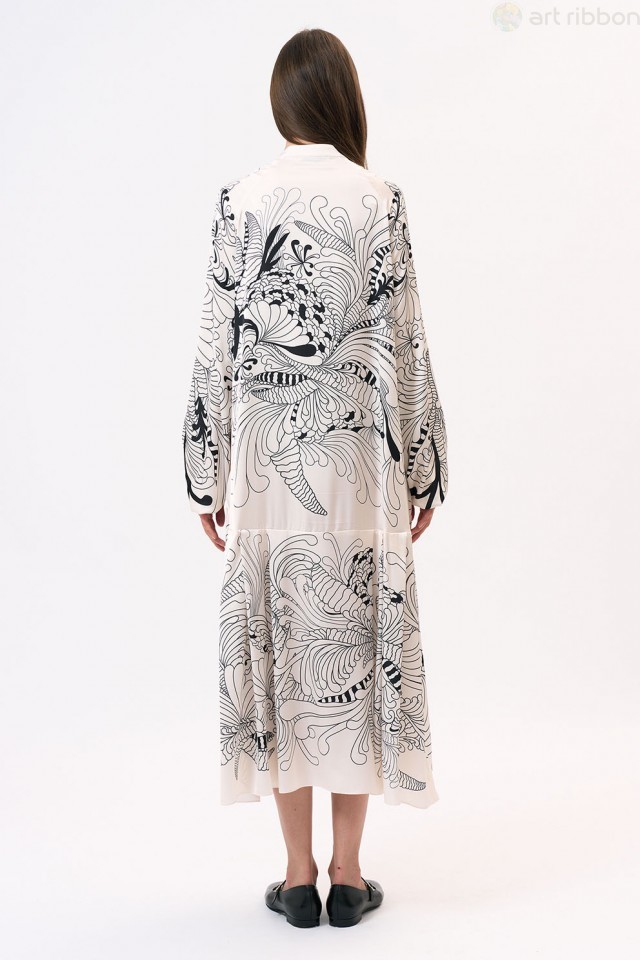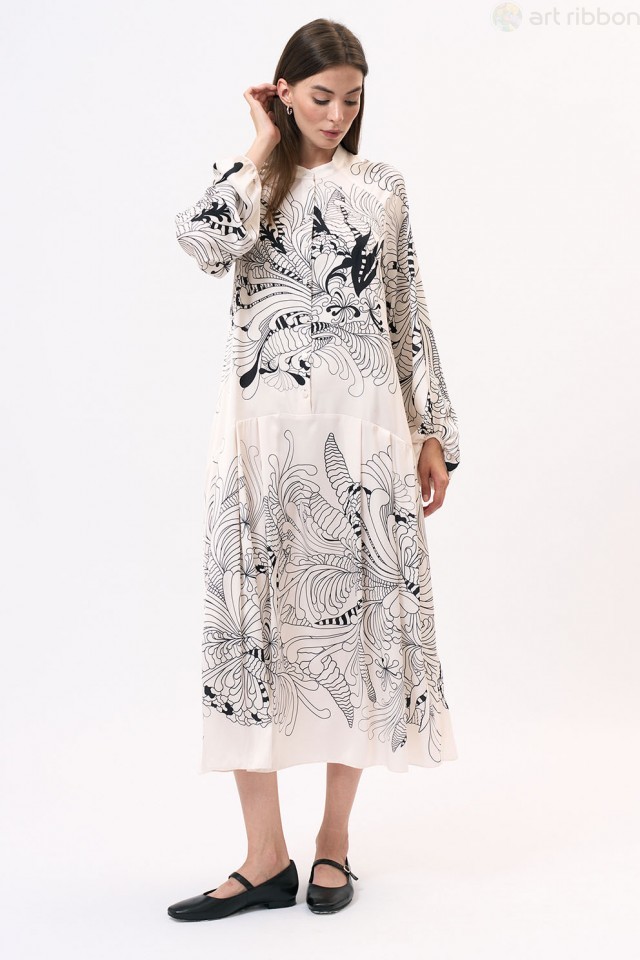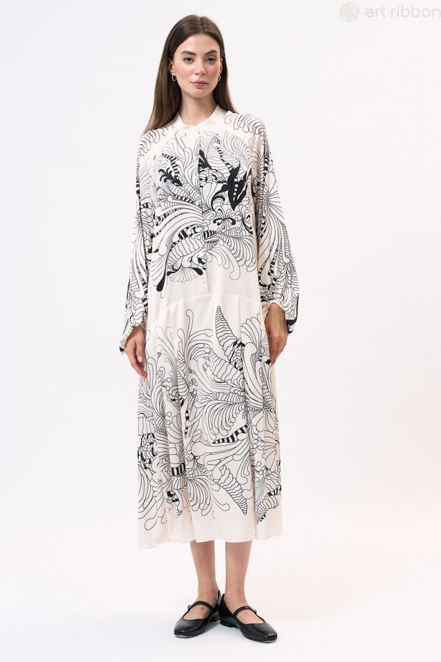 CHIFFON. Возможные размеры: 46-48-50-52. Плать полуприлегающего силуэта из шифона с дизайнерским принтом. Воротник рубашечного типа, застежка центральная на петли и пуговицы, в боковом шве обработана ... Показать описаниепотайная молния. Рукав длинный, втачной с манжетой. Платье отрезное по линии талии, на эластичной тесьме. Изделие на подкладке. Возможно отличие фотографии по оттенку, связанное с разной цветопередачей монитора. Состав ткани:Полиэстер: 100%. Длина по центру спинки (см): 128, 128, 128, 128. По груди (см): 49, 51, 53, 55. По бедрам (см): 73, 75, 77, 79. По талии (см): 42, 44, 46, 48. Длина рукава (см): 63, 63, 63, 63. Ширина рукава (см): 18.3, 19, 19.7, 20.4. Размер воротника (см): 22, 22.5, 23, 23.5. Ширина плеча (см): 12, 12.2, 12.4, 12.6. Ширина спинки (см): 37, 38, 39, 40. Подробное описание: https://artribbon.ru/m1054p-plat-e-zhenskoe.html
