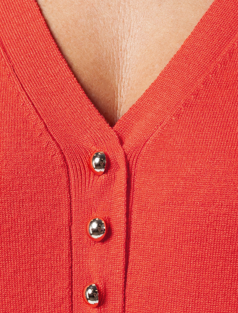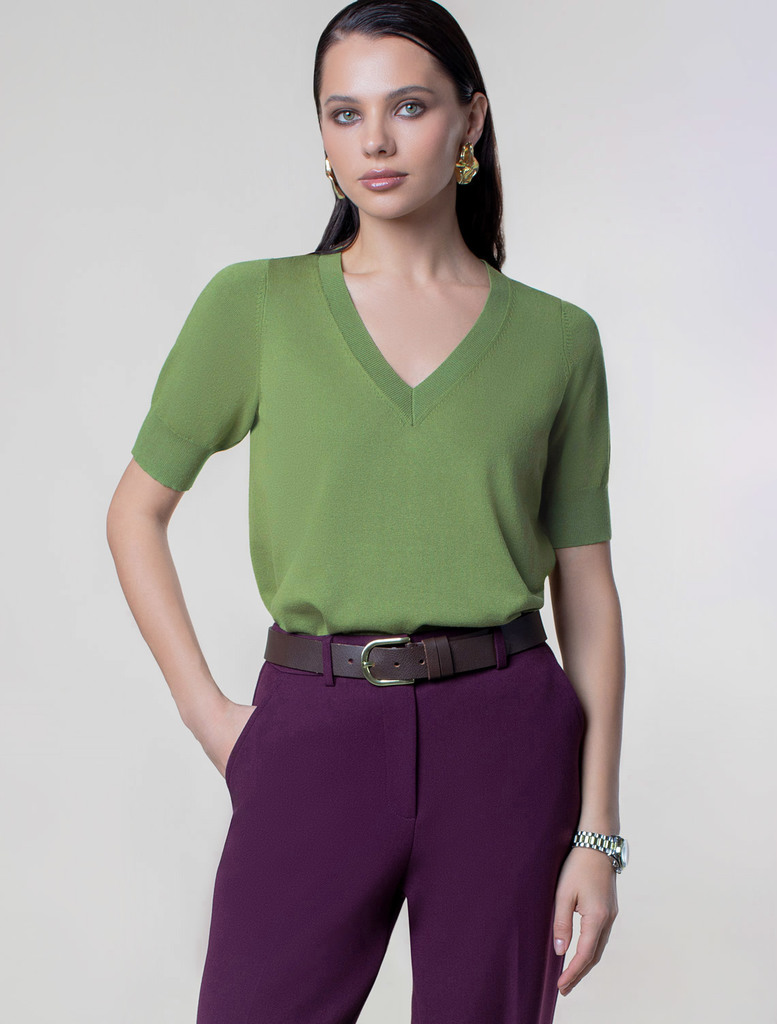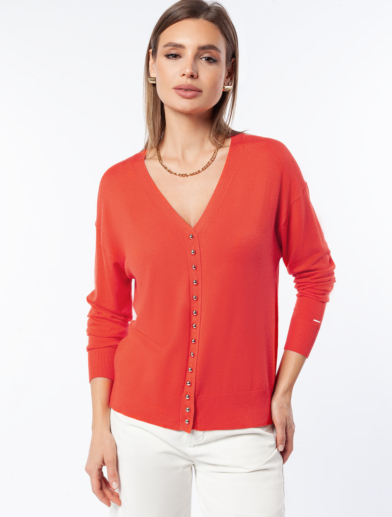 Состав: 83%Вис 17%ПА Плотность: 12 GG Параметры модели на первом фото: Рост 170, бюст 83, талия 64, бедра 88 Размер товара на первом фото: 42 Джемпер тонкой вязки из вискозы с нейлоном. Модель с V- вы... Показать описаниерезом прилегающего силуэта дополнена золотистыми пуговицами. Мягкая очень приятная к коже пряжа хорошо держит форму и гарантирует комфорт во время носки в течение всего дня. Изделие дополнено фирменным металлическим логотипом бренда.