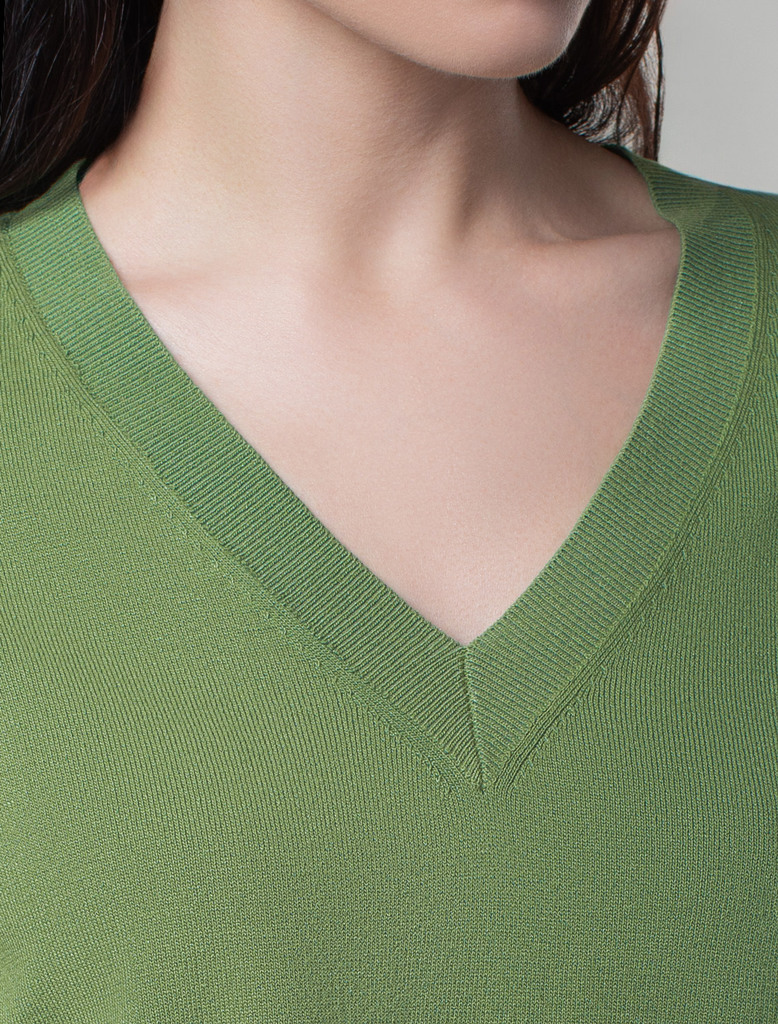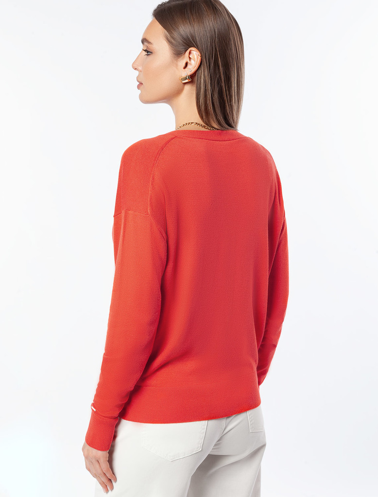 Состав: 83%Вис 17%ПА Плотность: 12 GG Параметры модели на первом фото: Рост 170, бюст 83, талия 64, бедра 88 Размер товара на первом фото: 42 Джемпер тонкой вязки выполнен из вискозы с нейлоном. Модел... Показать описаниеь с V-вырезом свободного силуэта. Мягкая очень приятная к коже пряжа не колется, хорошо держит форму и гарантирует комфорт во время носки в течение всего дня. Изделие дополнено фирменным металлическим логотипом бренда.