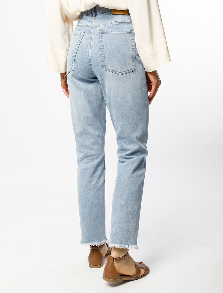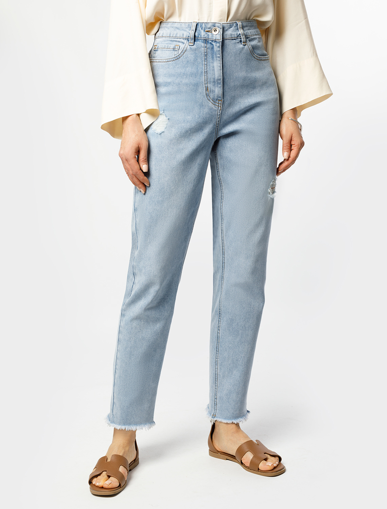 Состав: 70%Хлопок 28%ПЭ 2%ПУ Плотность: 11 OZ Параметры модели на первом фото: Рост 172, бюст 88, талия 64, бедра 88 Джинсы mom-fit в голубом оттенке выполнены из эластичного денима. Модель с эффектно... Показать описанией стиркой и декоративными рваными элементами, с бахромой по низу изделия. Изделие подходит для любой фигуры. На спинке фирменный брендированный патч.