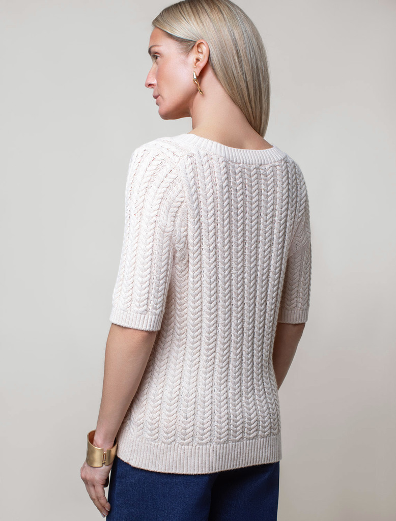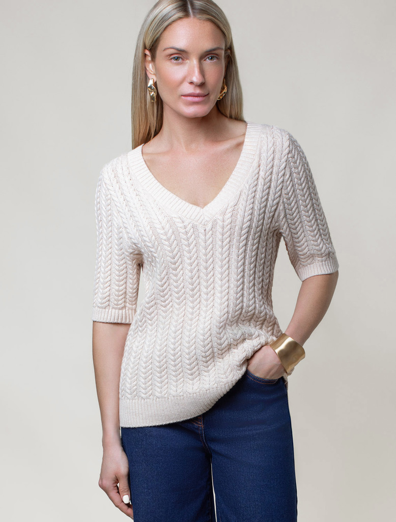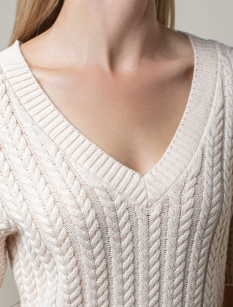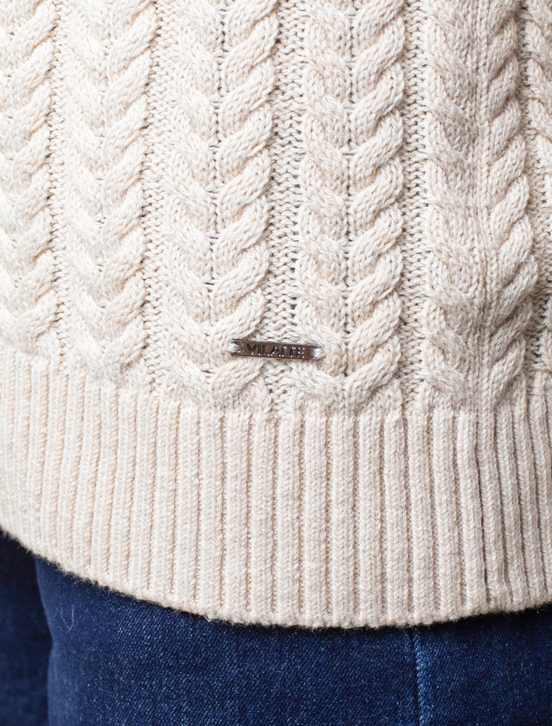 Состав: 70%Хлопок 21%ПА 9%Кашемир Плотность: 12 GG Размер товара на первом фото: 42 Джемпер фактурной вязки выполнен из хлопка с добавлением кашемира. Модель с V-вырезом с вывязанным орнаментом цепи. ... Показать описаниеМягкая и очень приятная пряжа совершенно не колется, сохраняет тепло при этом не перегревая, гарантируя безупречный комфорт.