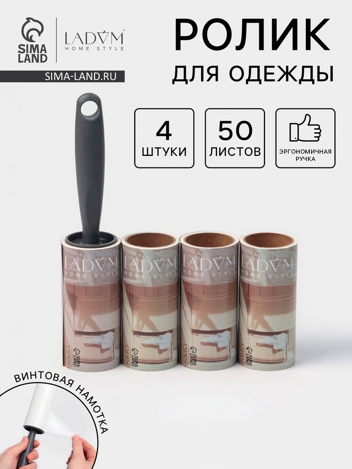 Ролик для одежды со сменными блоками LaDо?m, 4 шт. по 50 листов, эргономичная ручка, винтовая намоткаВопросы по товару