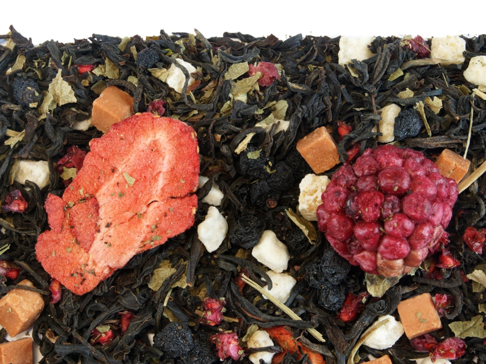 Незабываемый купаж черного крупнолистового чая (Индия) с кусочками клубники, ежевики, с лепестками королевской розы. Поистине напиток для королевы!