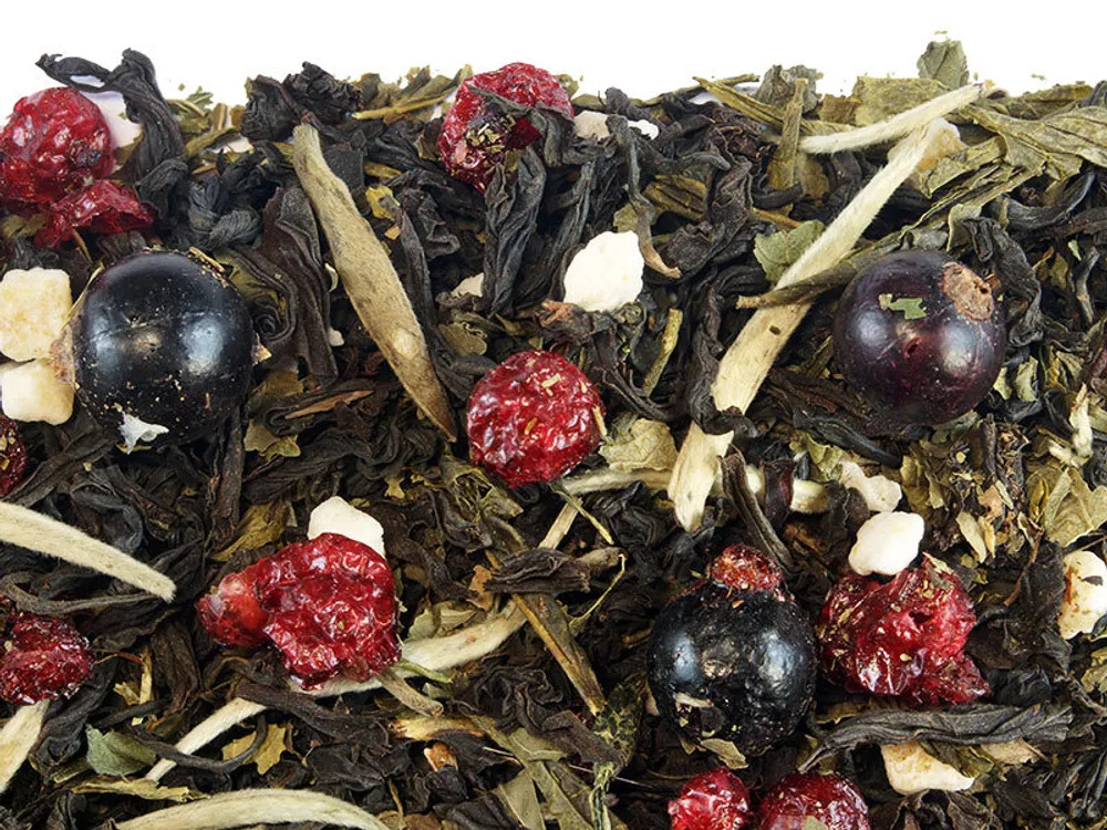 Зеленый чай в сочетании с листьями черной смородины и ежевики, кусочками клубники, малины и лепестками граната и василька приобретает незабываемый вкус, который не оставит равнодушным даже самого иску... Показать описаниешенного гурмана. Состав: чай зеленый рассыпной листовой крупный, ароматизаторы, листья черной смородины, листья ежевики, слайсы клубники, кусочки малины, лепестки василька, цветки граната.