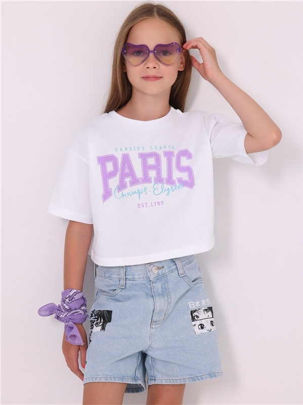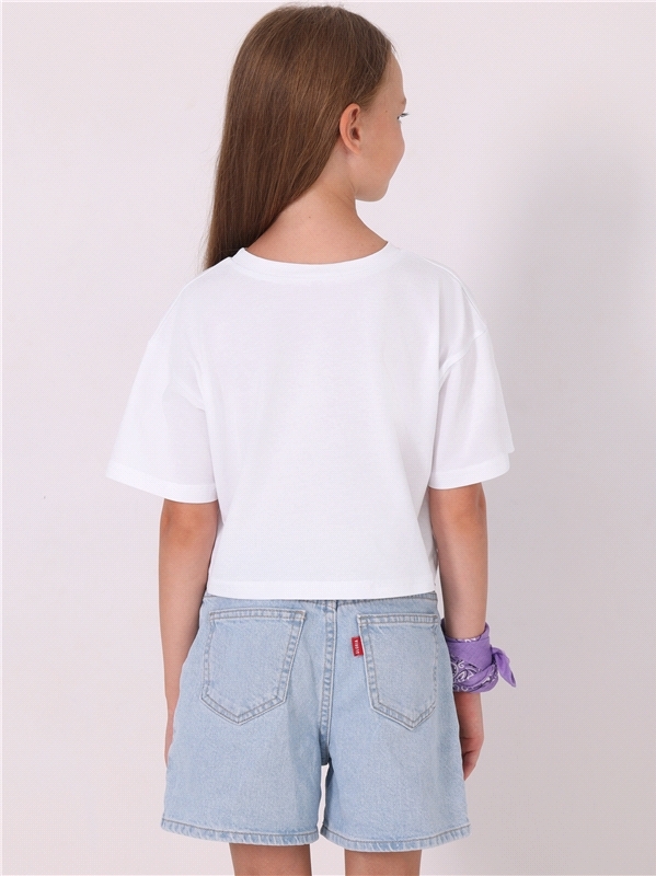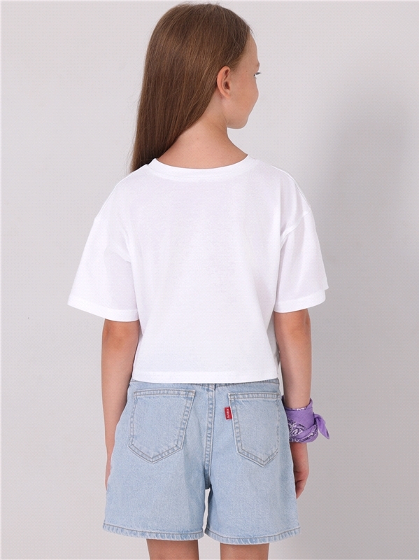 Укороченная футболка для девочки из кулира - легкого хлопкового полотна. Изделие с короткими рукавами со спущенным плечом, украшено печатью. Уход: только машинная стирка (руками не стирать!) при темпе... Показать описаниературе 40 градусов, без предварительного замачивания. Изделия с печатью и декором перед стиркой необходимо вывернуть на изнаночную сторону. Состав: кулир / хлопок 100%.