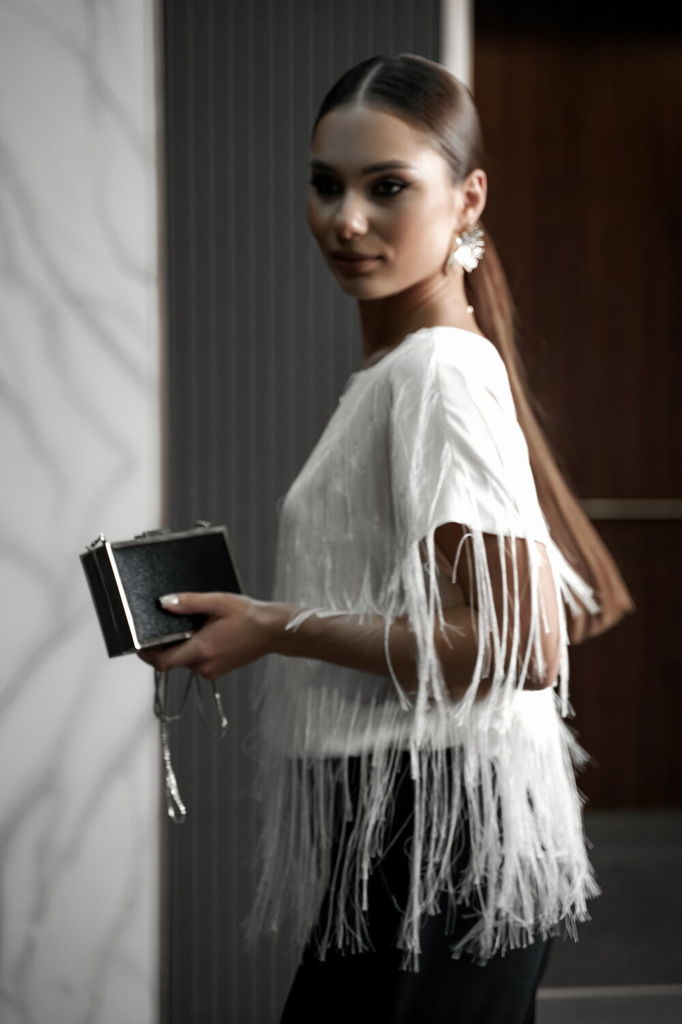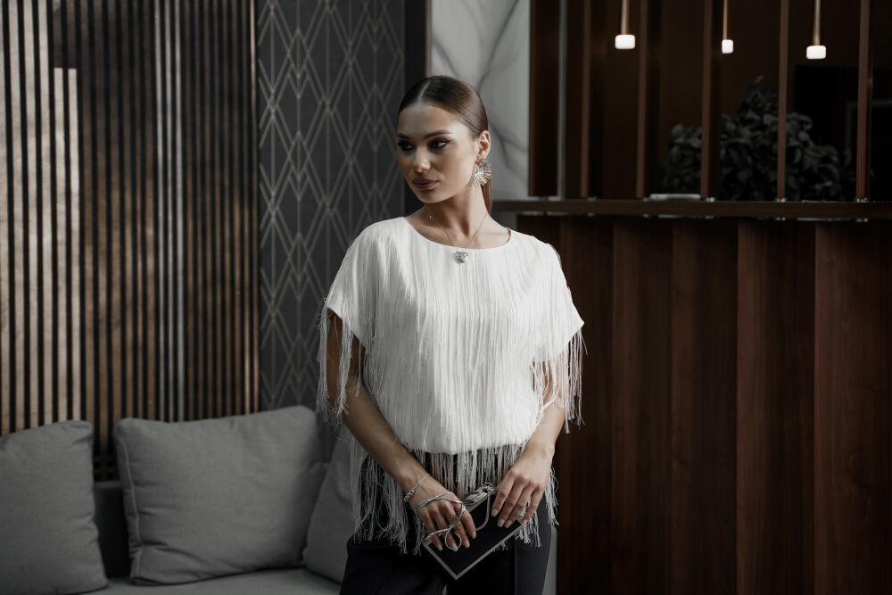 Состав: Блуза: ПЭ-100%; Подкладка: Вискоза-45%; ПЭ-55%; Блузка свободного силуэта с коротким цельновыкроенным рукавом, из нарядной плательно-блузочной ткани с бахромой. По переду горловина округлой фо... Показать описаниермы, по спинке-V-образной. Блузка на атласной подкладке. Длина 58 см. Измерения по готовому изделию: 44 р-р: ОГ - 104 см., ОТ - 102 см., ОБ - 106 см. 46 р-р: ОГ - 108 см., ОТ - 106 см., ОБ - 110 см. 48 р-р: ОГ - 112 см., ОТ - 110 см., ОБ - 114 см. 50 р-р: ОГ - 116 см., ОТ - 114 см., ОБ - 118 см. 52 р-р: ОГ - 120 см., ОТ - 118 см., ОБ - 122 см.