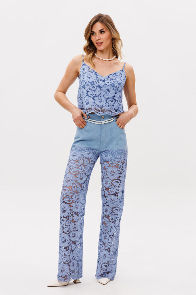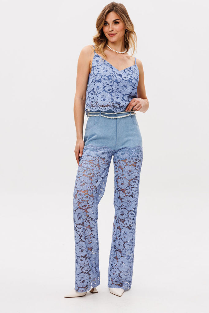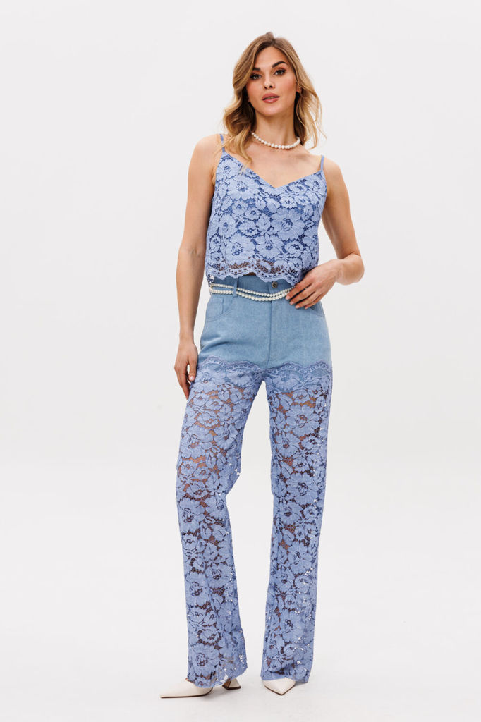 Состав: Хлопок-98%; ПУ-2%; Брюки выполнены из джинса с отделкой из гипюра. Брюки прямого покроя, длиной в пол, на притачном поясе. Верхняя часть брюк выполнена из джинса, нижняя часть из гипюра. Спере... Показать описаниеди боковые карманы с фигурным входом и застежка на молнию. На задних частях кокетки и накладные карманы. Пояс застегивается на пробивную пуговицу. Длина брюк: 110 см. Гарантийный срок не установлен ГОСТ 25294 - 2003