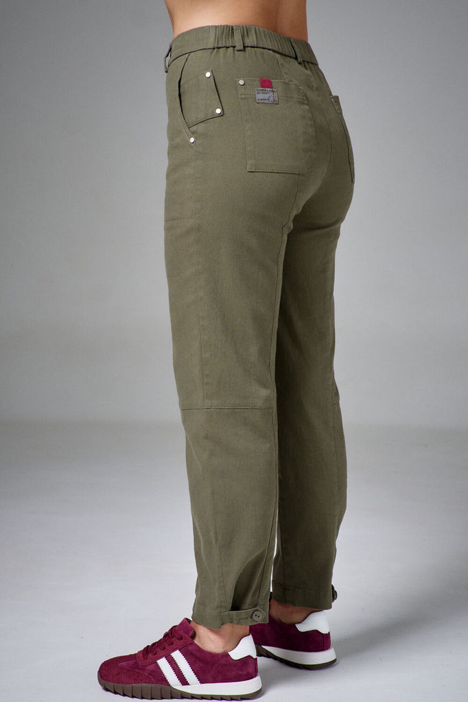 Состав: ПЭ-26%; Хлопок-70%; Эластан-4%; Брюки из хлопкового джинса со стрейчем длиной до косточки, силуэтной формы "бананы", с четырьмя функциональными карманами и одним декоративным. Передние и задни... Показать описаниее половинки брюк с вертикальными швами по центру. В боковой части, на уровне колена, горизотальные подезы. Ширина брюк по низ регулируетсяхлястикм с засежкой на пуговцу. Изделие декорировано хольнитенами и нашивками.