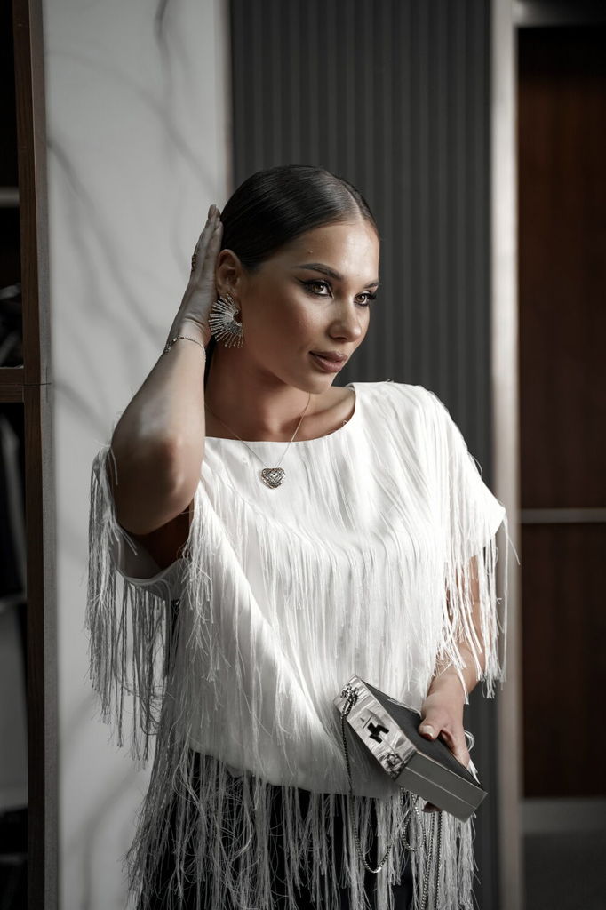 Состав: Блуза: ПЭ-100%; Подкладка: Вискоза-45%; ПЭ-55%; Блузка свободного силуэта с коротким цельновыкроенным рукавом, из нарядной плательно-блузочной ткани с бахромой. По переду горловина округлой фо... Показать описаниермы, по спинке-V-образной. Блузка на атласной подкладке. Длина 58 см. Измерения по готовому изделию: 44 р-р: ОГ - 104 см., ОТ - 102 см., ОБ - 106 см. 46 р-р: ОГ - 108 см., ОТ - 106 см., ОБ - 110 см. 48 р-р: ОГ - 112 см., ОТ - 110 см., ОБ - 114 см. 50 р-р: ОГ - 116 см., ОТ - 114 см., ОБ - 118 см. 52 р-р: ОГ - 120 см., ОТ - 118 см., ОБ - 122 см.
