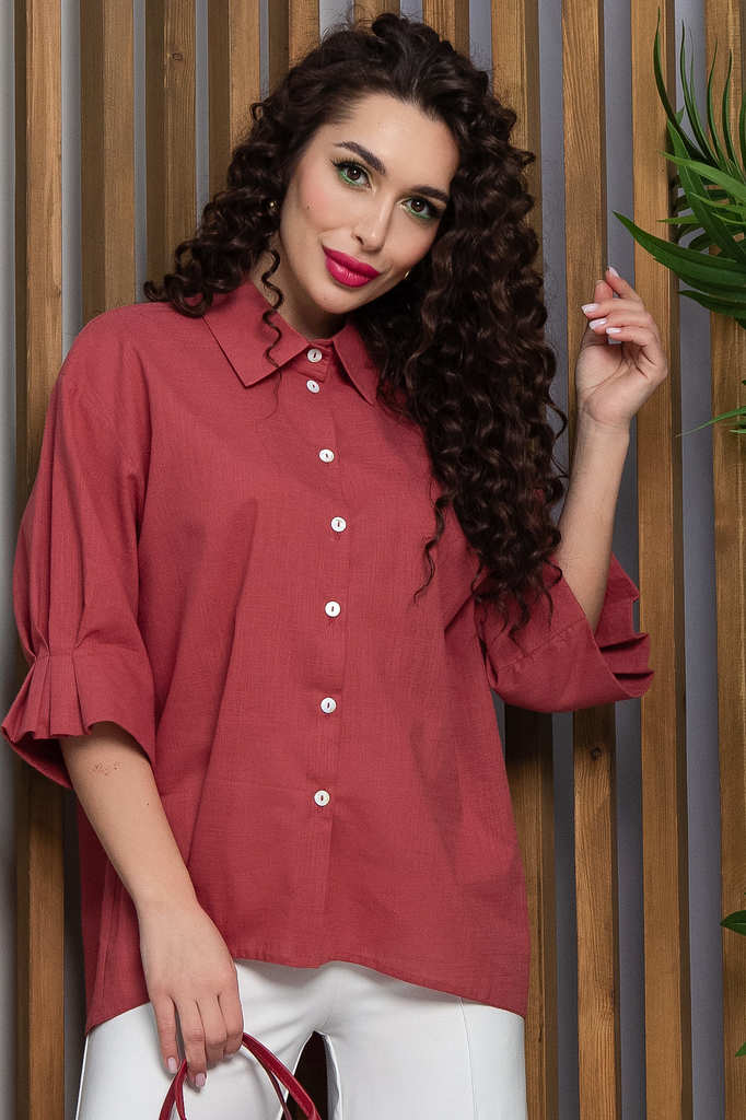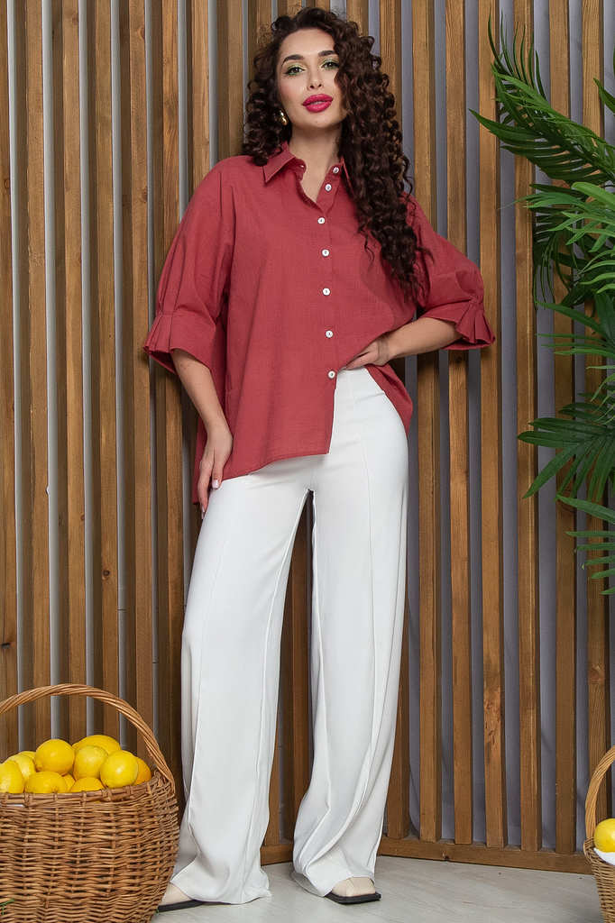 Состав: Вискоза-30%; ПЭ-17%; Эластан-3%; Лён-50%; Состав: 50% лен, 30% вискоза, 17% полиэстер, 3% эластан. Материал: лён. Цвет: терракотовый. Принт: отсутствует. Силуэт: свободный. Карманы: отсутствую... Показать описаниет. Подкладка: отсутствует. Вид застежки: пуговицы. Декоративные элементы: люверсы сзади. Длина: 44/ 69 см, 46/ 70 см, 48/ 71 см, 50/ 72 см, 52/ 73.5 см, 54/ 74 см. Блузка отснята с брюками арт.Б12685-13 Льняная рубашка свободного кроя — это идеальный выбор для создания стильного и комфортного образа! Её отличительной чертой является разрез на спинке, который придаёт ей оригинальность. Люверсы, соединённые тканевой завязкой сзади, добавляют образу интересный акцент. Рукав длиной 3/4 с манжетами и защипами создаёт стильный и аккуратный вид.