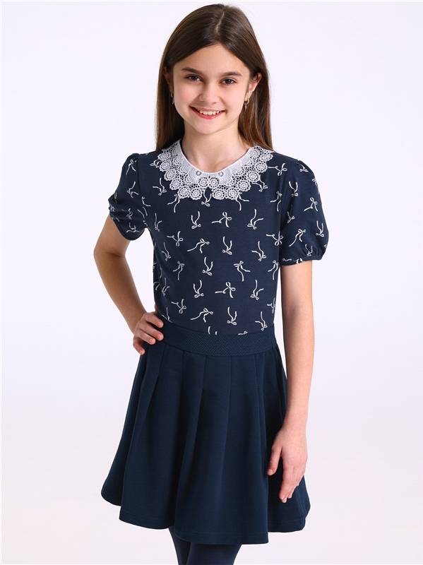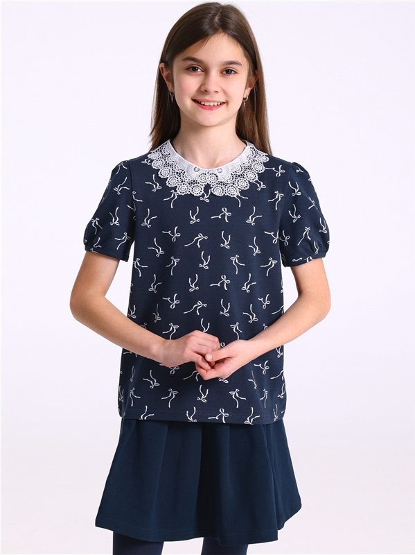 Блузка для девочки выполнена из кулира - легкого хлопкового полотна с лайкрой. Изделие с короткими присборенными рукавами на манжетах и застежкой на пуговку по спинке, украшено нежным кружевным воротн... Показать описаниеичком. Отличный вариант для школы! Уход: только машинная стирка (руками не стирать!) при температуре 40 градусов, без предварительного замачивания. Состав: кулир с лайкрой / хлопок 92% + лайкра 8%.