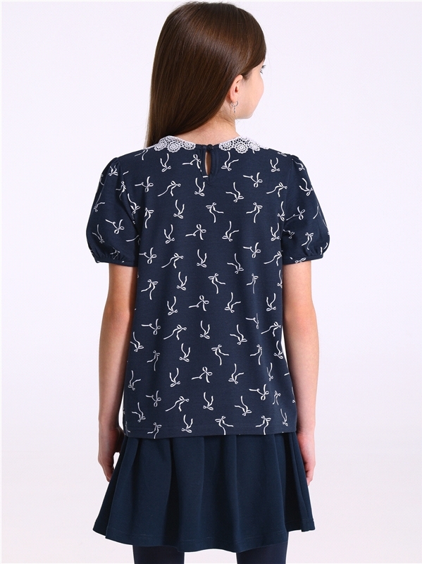 Блузка для девочки выполнена из кулира - легкого хлопкового набивного полотна с лайкрой. Изделие прямого силуэта с короткими рукавмами. Воротник отложной, дополнен декоративным бантом с пуговицей. На ... Показать описаниеспинке застежка на пуговицу. Уход: только машинная стирка (руками не стирать!) при температуре 40 градусов, без предварительного замачивания. Состав: кулир с лайкрой / хлопок 92% + лайкра 8%.