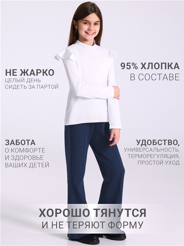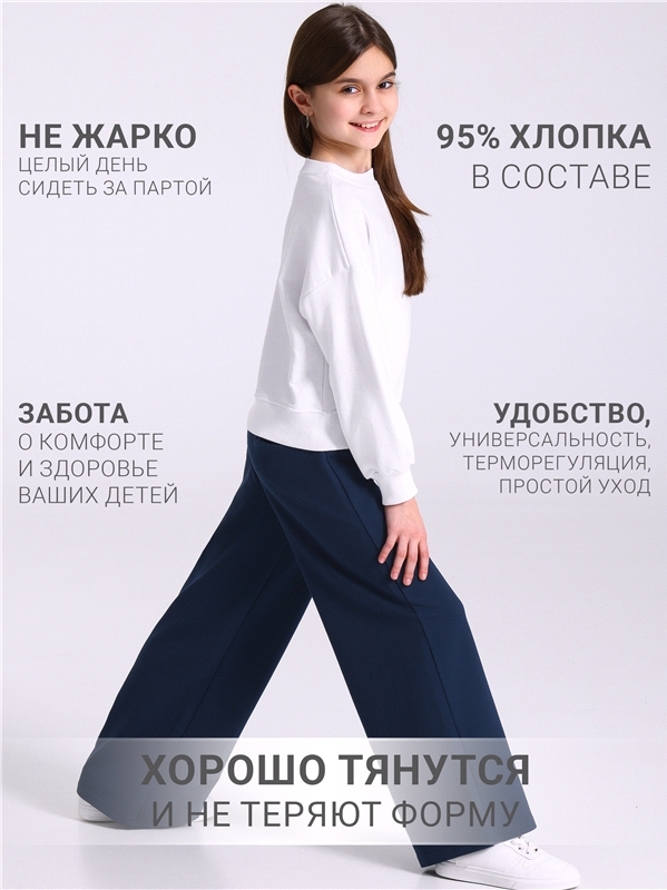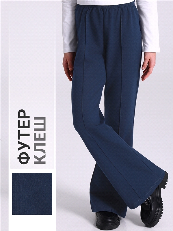 Школьные брюки-клёш для девочки выполнены из футера - тонкого хлопкового полотна с содержанием полиэстера. Изделие со средней высотой посадки, без карманов, декорировано острочками-стрелками. Уход: то... Показать описаниелько машинная стирка (руками не стирать!) при температуре 40 градусов, без предварительного замачивания. Ассортимент осенне-зимнего периода. Состав: футер / хлопок 75% + ПЭ 20% + лайкра 5%.