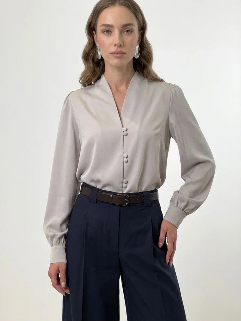 Состав: 45% полиэстер, 35% вискоза, 20% шелк,. Материал: Вискоза, Полиэстер, Шелк. Длина по спинке: 63 см. Длина рукава: 68,6 см. Принт: Однотонный. Рукав: Длинный. Сезон: Осень, Весна, Зима. Силуэт: ... Показать описаниеПрямой. Стиль: Повседневный, Деловой, Вечерний. Тип горловины: V-образный. Блузка прямого силуэта. Из однотонной блузочной ткани. Воротник-стойка с V-образным вырезом.Рукав втачной, длинный со сборкой по плечу и по низу, на манжете. Застежка на навесные петли и пуговицы на ножке. Рост модели 170 см. Изделие на модели 42 р-ра. Длина изделия по спинке 63 см. Подробное описание: https://seller.tantino.ru/bluza-s-vyrezom-7.html