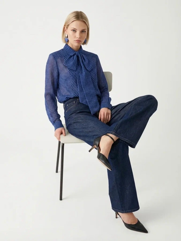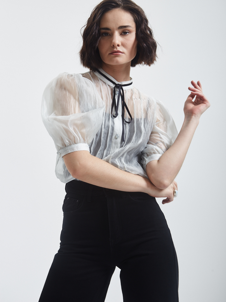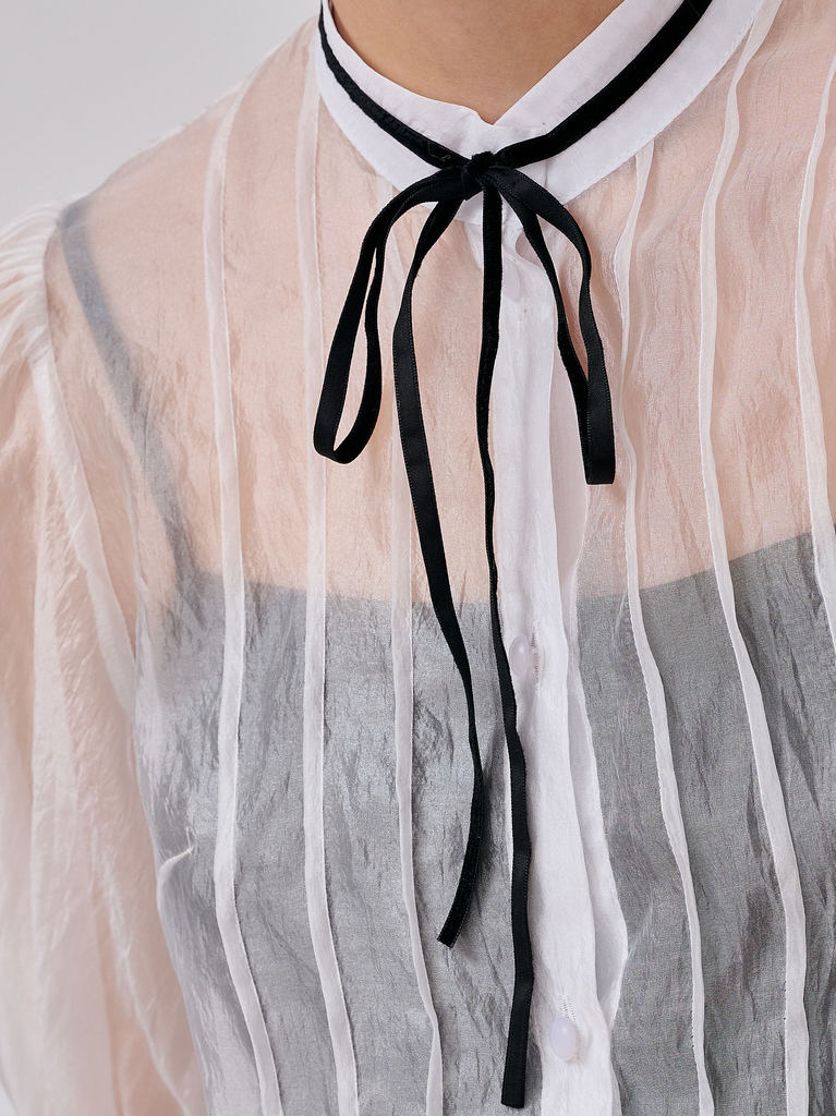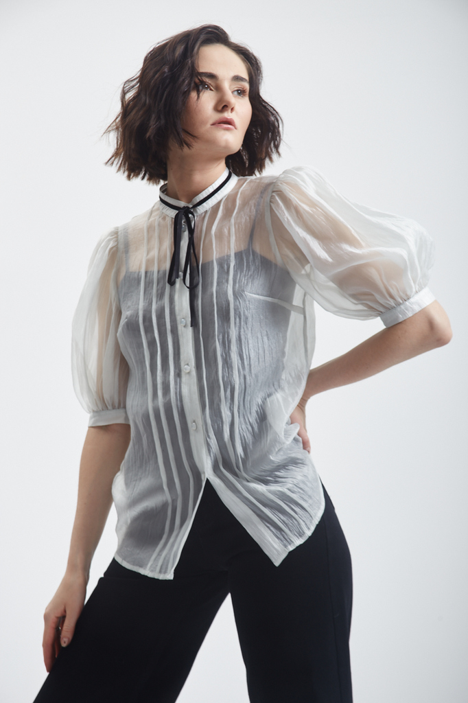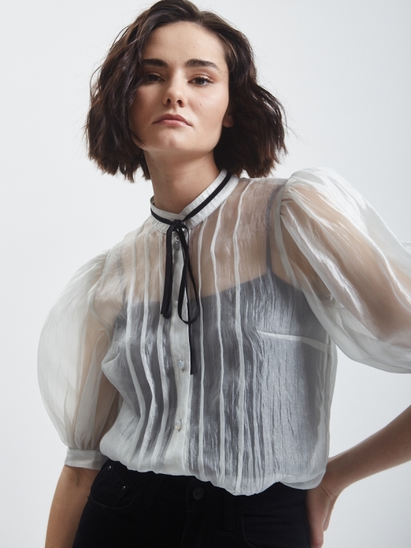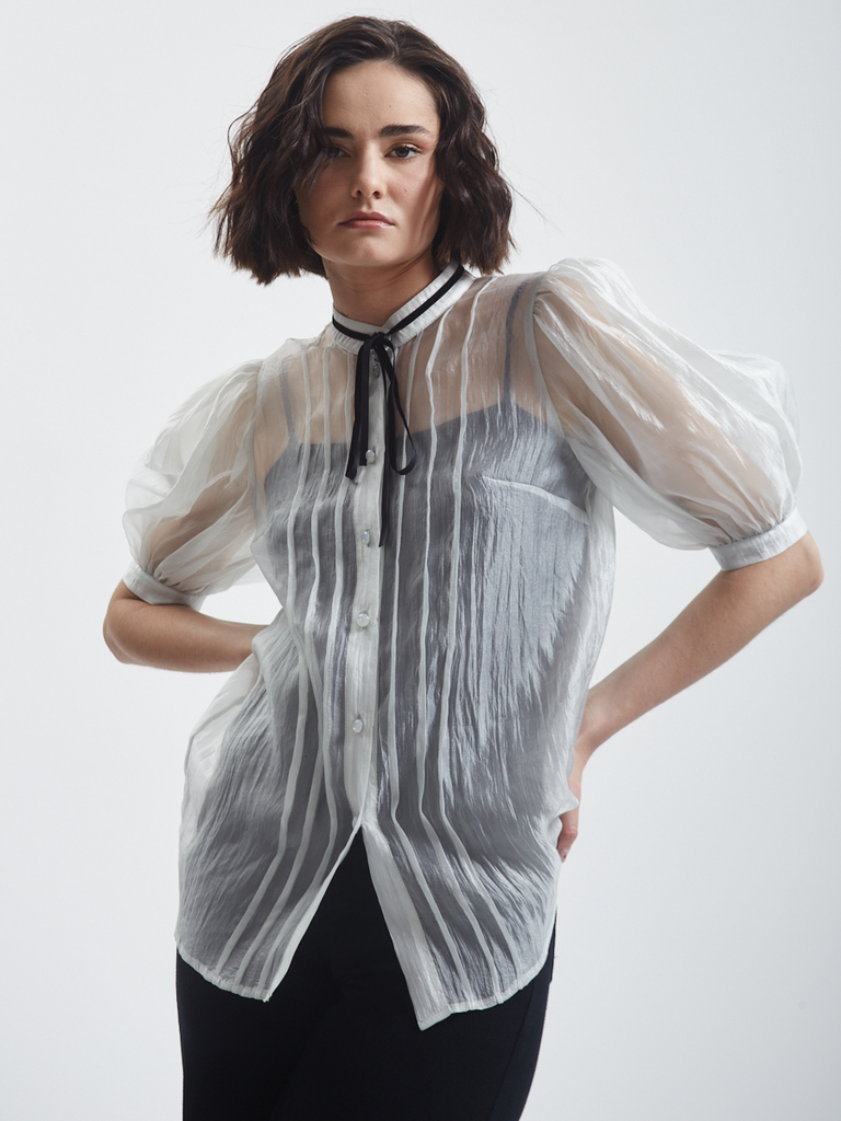 Блузка из органзы прямого силуэта с воротником-стойкой и завязкамиВопросы по товару