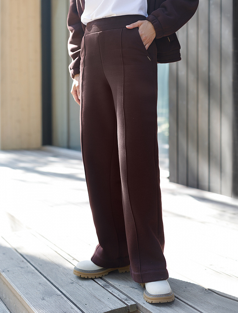 Состав: 80%Хлопок 20%ПЭ Плотность: 320 Г/м2 Размер товара на первом фото: 42 Сочетается с артикулами: D49.061, D49.102, D49.103 Теплые брюки прямого кроя с удобным поясом на резинке и карманами по бок... Показать описаниеам выполнены из премиального футера-трехнитки. Наличие эластана в составе гарантирует комфорт и долговечность изделия, материал хорошо пропускает воздух, позволяя телу дышать, а мягкий начес обеспечивает дополнительное тепло и комфорт в прохладную погоду. Эти уютные брюки актуального коричневого цвета созданы для вашего комфорта. Свободный прямой крой обеспечивает свободу движений и максимальное удобство в любых ситуациях, поэтому они подойдут и на большие размеры, а так же на высокий или низкий рост. Фигура подчеркивается, а силуэт визуально вытягивается за счет кроя палаццо и застроченных декоративных стрелок. В повседневных трикотажных брюках вы будете чувствовать себя комфортно и уверенно, наслаждаясь каждым моментом дня.