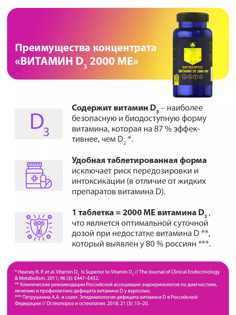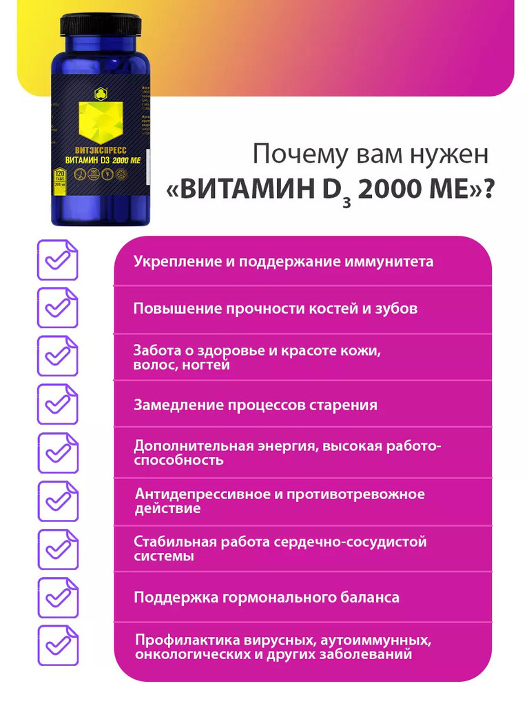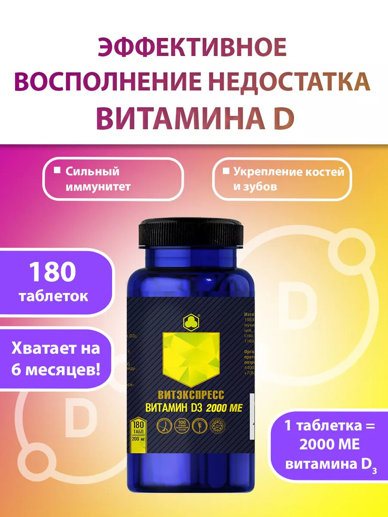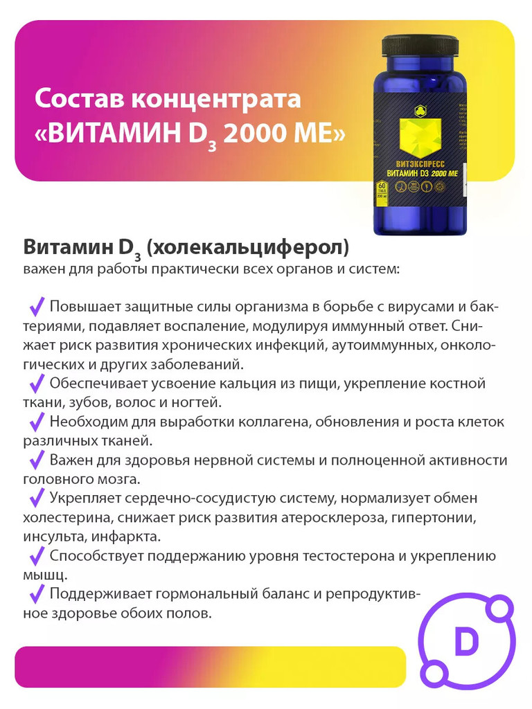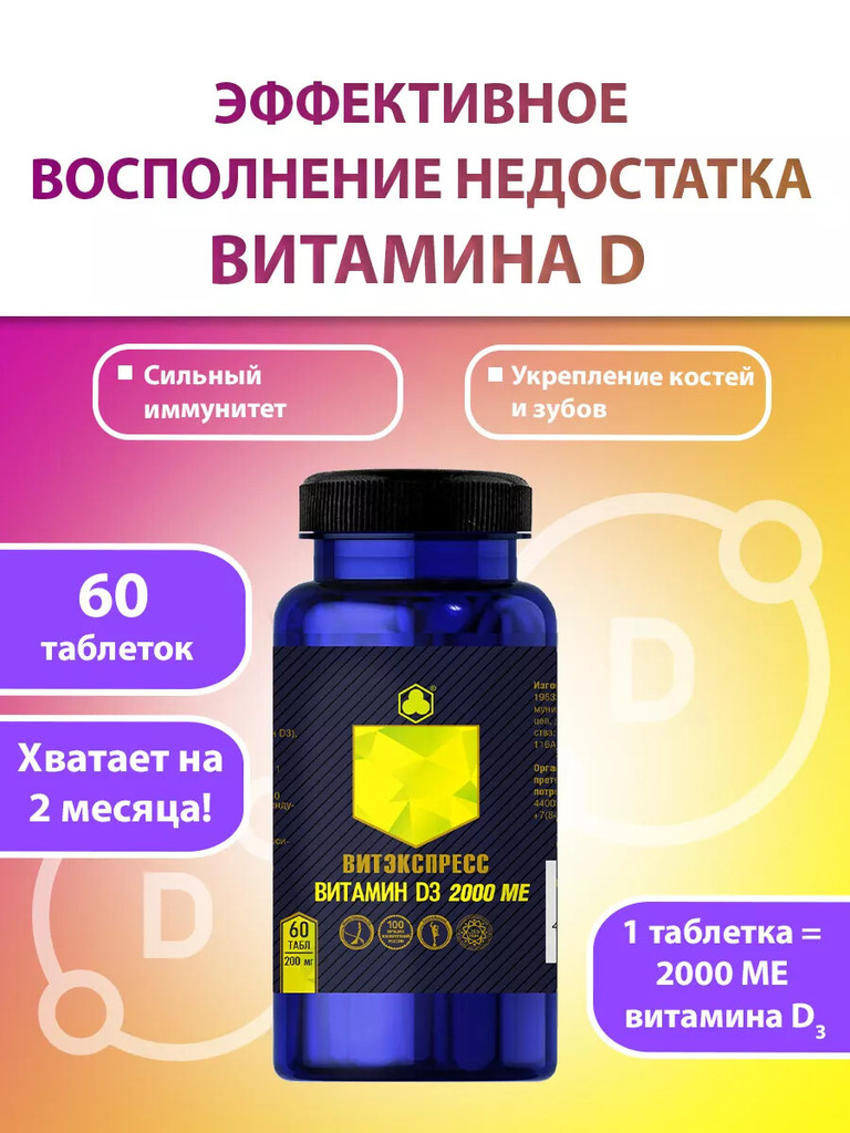ВИТАМИН D3 2000 МЕ Витэкспресс — Концентрированный витаминно-минеральный продукт для восполнения дефицита витамина D. Для профилактики и устранения связанных с гиповитаминозом состояний. Показания: Ре... Показать описаниекомендуется в качестве пищевого концентрата – дополнительного источника холекальциферола: - для профилактики и в комплексной терапии состояний, связанных с гиповитаминозом D3; - для поддержания здоровья костной системы при дефиците солнечного света; - для профилактики и в комплексной терапии травм костей; - при ухудшении обменных процессов, в том числе нарушении усвоения кальция; - в качестве иммуномодулирующего средства; - для профилактики и в комплексной терапии кожных заболеваний; - при планировании беременности; - при возрастном дефиците половых гормонов. Способ применения: Перорально. Взрослым по 1 таблетке в день. Продолжительность приёма – 1 месяц. При необходимости прием можно повторить. Пищевой концентрат не следует использовать как замену полноценного рациона питания. Номер сертификата: ДС ЕАЭС № RU Д-RU.РА07.В.20965_24 от 16.08.2024